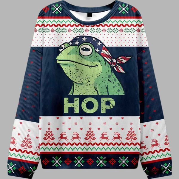 This exceptionally imaginative sweater is a striking addition to the ugly Christmas sweater tradition, designed for those who appreciate freedom and a good dose of absurdity. The captivating center graphic features a calm, confident frog wearing a bandana patterned with the American flag’s stars and stripes, giving it a cool, slightly defiant, and instantly recognizable look. Beneath this patriotic amphibian, the simple, commanding text “HOP” is boldly displayed. The design itself cleverly uses red, white, and dark blue, reminiscent of the flag, while incorporating classic fair isle-inspired borders featuring Christmas trees, reindeer, and snowflakes. This garment is far more than just holiday apparel; it’s a humorous, wearable symbol of independence, resilience, and the power of a single, determined voice. It’s an ideal way to showcase your witty, unique personality and inject some unforgettable, laugh-out-loud style into any Christmas gathering, proving that even a frog can embody the spirit of freedom.