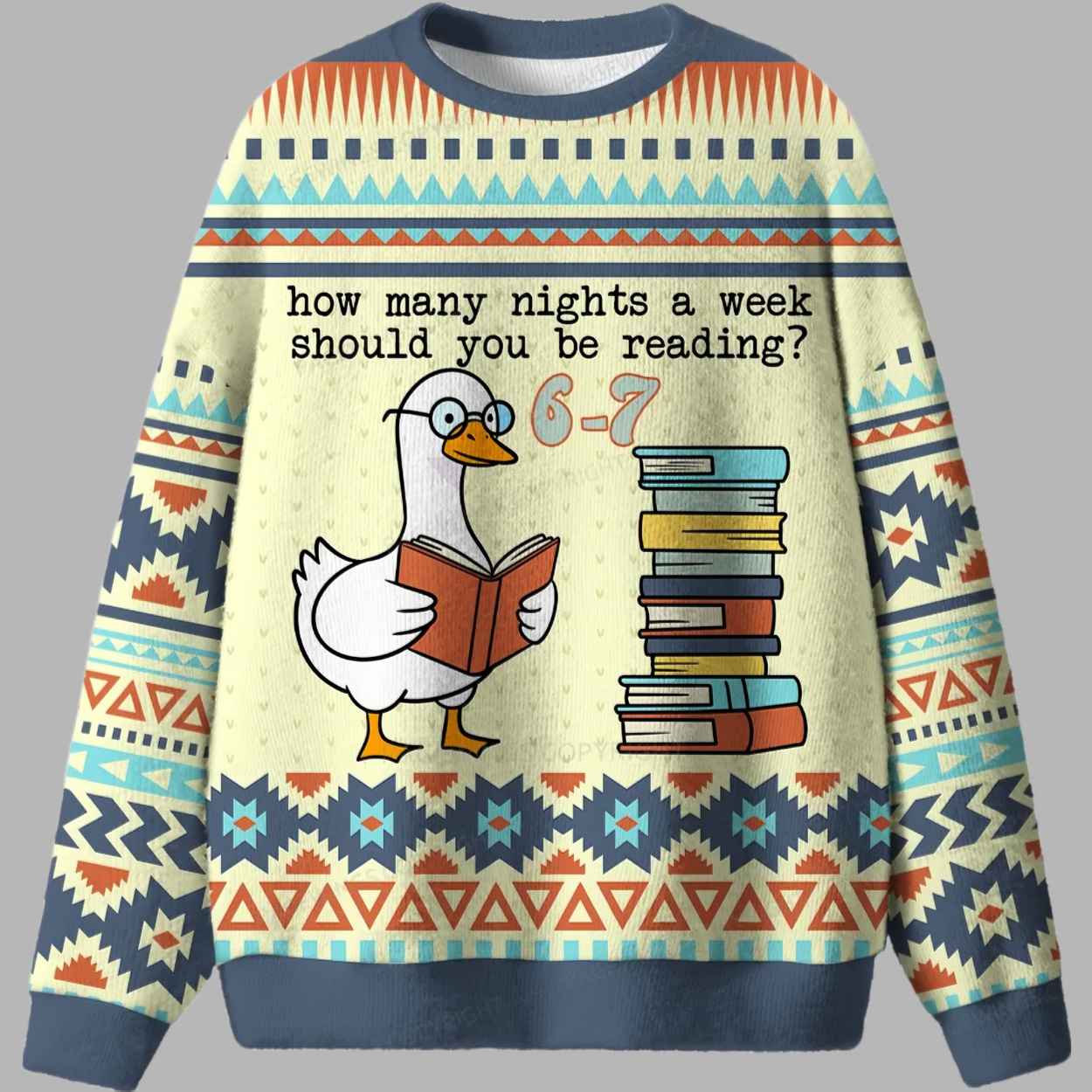 This spectacular sweater features a soft, inviting creamy-yellow background, beautifully contrasted by rich, rustic patterns in navy blue, burnt orange, and white. The central graphic is a charming, intellectual goose, wearing spectacles and holding an open book, standing next to a tall, neatly stacked pile of colorful novels. Above this studious scene, the text poses the important question: “how many nights a week should you be reading?” and the answer, provided by the wise goose, is boldly displayed: “6-7”. The entire design cleverly blends this witty, self-aware intellectual humor with a cozy, Aztec-inspired “ugly Christmas sweater” aesthetic. The borders and sleeves feature intricate geometric shapes, zigzags, and arrow patterns, giving the sweater a unique, folk-art feel that is both festive and unconventional. The entire look is a beautiful celebration of literature, humor, and the comfort of knowledge. This sweater is far more than a simple novelty item; it’s a brilliant piece of visual comedy that validates the intense passion of book lovers, suggesting that the pursuit of reading should be a near-daily commitment. It appeals to the wearer who possesses a sharp, self-aware sense of humor, values intellectual pursuits, and finds a comforting joy in curling up with a good book, making it a cozy, witty, and immediate symbol of literary devotion.
