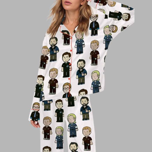 This exceptionally unique and utterly charming pajama set is a fantastic tribute to a beloved television series or group of fictional professionals. The sleek, white silky satin fabric is covered in a hilarious, all-over pattern of colorful, whimsical illustrations of the main characters—likely doctors and nurses—in their distinctive scrubs and attire. The caricature style of the figures adds a lighthearted, collectible feel, making it an instant conversation piece for fans. The set itself features a classic button-down top with stylish red piping and matching full-length pants, providing a chic and comfortable fit. This garment is far more than just comfortable loungewear; it’s a wearable symbol of fandom, the power of friendship, and the shared connection found through watching a great show. It’s an ideal way to channel the show’s witty, character-driven spirit and bring a touch of graceful, whimsical charm to your mornings and evenings.