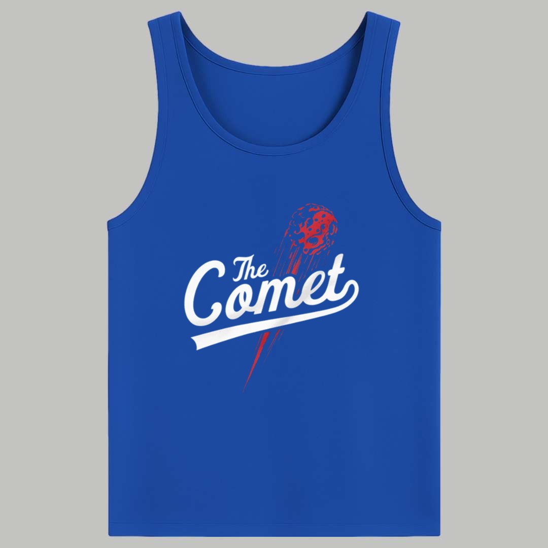 The central design is a clever nod to Hyeseong Kim’s nickname, “The Comet.” The phrase “The Comet” is written in a clean, white script font, giving it a classic, retro feel. Above the text, a red soccer ball is depicted as a meteor streaking through the sky, leaving a trail of red behind it, perfectly symbolizing the player’s explosive speed and power. The bold blue of the shirt makes the red and white graphics pop, ensuring the design is eye-catching and memorable.