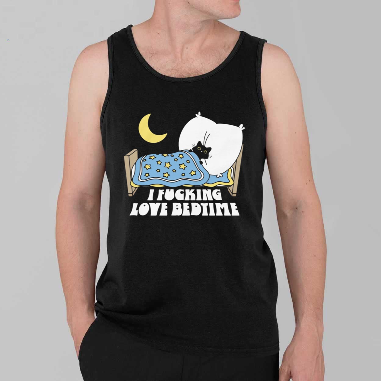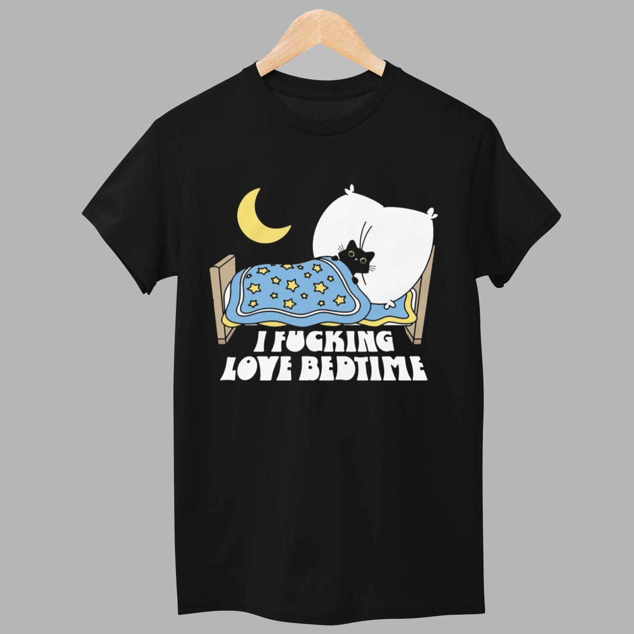 The front of the shirt features a bold graphic that perfectly visualizes the sentiment. A charming cartoon of a black cat is shown cozily tucked into a bed with a pillow and a blanket under the glow of the moon. Below the illustration, the text “I FUCKING LOVE BEDTIME” is printed in a playful font. This shirt serves as a piece of commemorative apparel for a specific, modern cultural phenomenon: the widespread internet humor that celebrates the simple joys of staying home, relaxing, and, most importantly, sleeping. It perfectly captures the spirit of a lighthearted joke that resonates with a wide audience, making it a conversation starter and a fun way to connect with others who appreciate a good laugh.