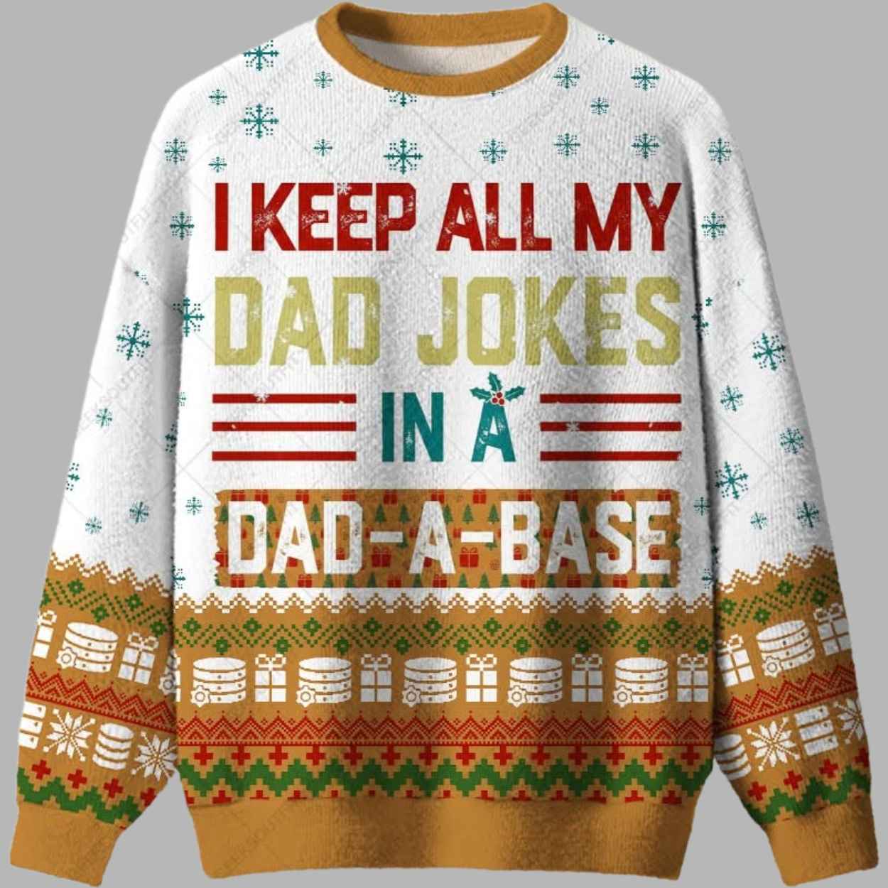 This cozy sweater features a light, off-white knit base with warm caramel brown and olive green trim, creating a comfortable, earthy holiday palette. The borders are adorned with classic fair isle patterns, cleverly incorporating stylized barrels (resembling a database icon) and wrapped gift boxes. The centerpiece proudly displays the ultimate, groan-inducing pun in bold, multi-colored text: “I KEEP ALL MY DAD JOKES IN A DAD-A-BASE.” The design uses decorative banners and subtle snowflakes to frame the core joke. This sweater’s meaning is a brilliant, humorous celebration of parental pride, tech culture, and the universally acknowledged love (and terror) of the dad joke. It humorously acknowledges the dedication required to maintain a ready supply of puns, suggesting that the perfect joke requires both data organization and timing. Wearing this piece signals a fun-loving, witty, and self-aware personality, someone who embraces their comedic status and is ready to connect with others through shared, corny humor. It’s the perfect, cozy way to make an instantly recognizable, funny, and endearing statement to fellow parents and joke-tellers.