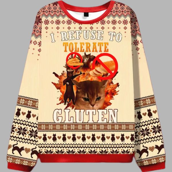 This spectacularly unique sweater is a phenomenal, statement-making addition to the ugly Christmas sweater canon, designed for those with dietary restrictions who appreciate cat memes and bold, self-aware humor. The captivating center graphic features an intense, dramatic scene involving a group of fierce cats looking absolutely outraged by the presence of gluten-filled bread (which is clearly crossed out with a prohibition sign). One cat strikes a powerful pose against an explosive background, symbolizing the firm refusal to ingest the forbidden food. Above and below this dramatic feline confrontation, the bold text delivers the clear message: “I REFUSE TO TOLERATE GLUTEN.” The entire scene is set against a warm, ribbed, off-white background and is framed by traditional fair isle-inspired borders featuring repeating motifs of cats, hearts, and snowflakes in festive red, white, and brown. This garment is far more than just holiday apparel; it’s a brilliant, humorous symbol of relatable dietary struggles, self-advocacy, and the joy of embracing one’s inner stubbornness during the festive season. It’s an ideal way to showcase your witty, unique personality and inject some unforgettable, laugh-out-loud charm into any Christmas gathering, while also gently reminding everyone not to offer you bread.