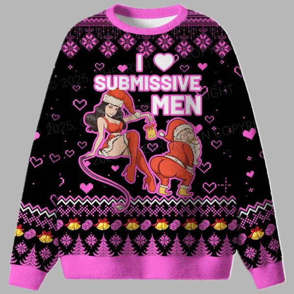 This outrageously funny sweater features a striking, high-contrast palette of deep black and vibrant hot pink, instantly grabbing attention. The centerpiece is a deliberately provocative and humorous graphic: a woman dressed in a very revealing Mrs. Claus costume, confidently sitting on a gift box while holding a leash attached to a Santa Claus figure who is bent over in a submissive position, wearing a chastity cage. Above this scene, the bold, clear text declares: “I ❤️ SUBMISSIVE MEN”, leaving absolutely no doubt about the sweater’s highly specific and cheeky theme. The entire design is framed by intricate “ugly Christmas sweater” patterns rendered in the same high-energy pink and black. These motifs include repeating pink hearts, geometric snowflakes, Christmas trees, and small bells and dice along the bottom border. The deliberate clash between the cozy, traditional knit aesthetic and the shocking, highly adult central theme is the heart of the sweater’s comedic appeal. This sweater is far more than a novelty item; it’s a bold piece of social satire that subverts traditional holiday gender roles and Christmas imagery with humorous confidence. It appeals to the wearer who possesses a fearless, uninhibited sense of humor, appreciates irony, and is determined to be the absolute center of attention, transforming a fun sweater into an unforgettable statement of playful power and audacity.