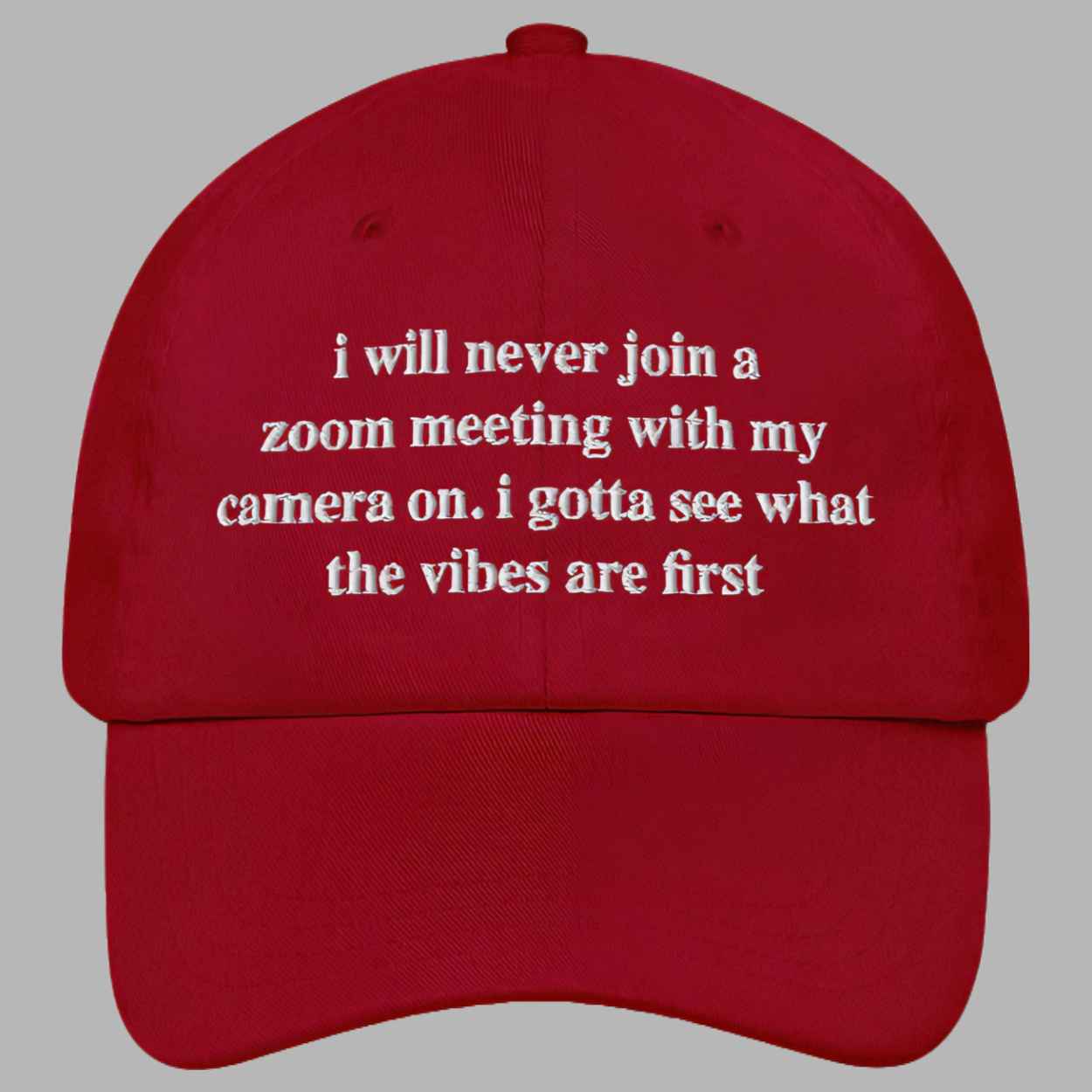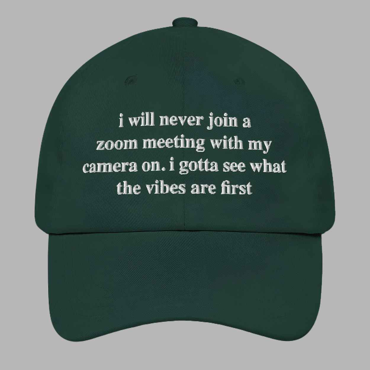 The front of the hat features the honest, all-too-real internal monologue of every remote worker: “i will never join a zoom meeting with my camera on. i gotta see what the vibes are first.” This hat commemorates the massive cultural shift to remote work and the rise of video conferencing platforms like Zoom. It perfectly captures the shared, unspoken experience of digital meetings—the need to gauge if the call requires full professional attire or if sweatpants are acceptable.