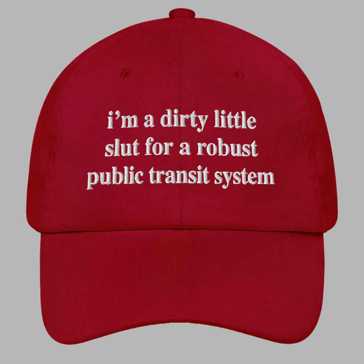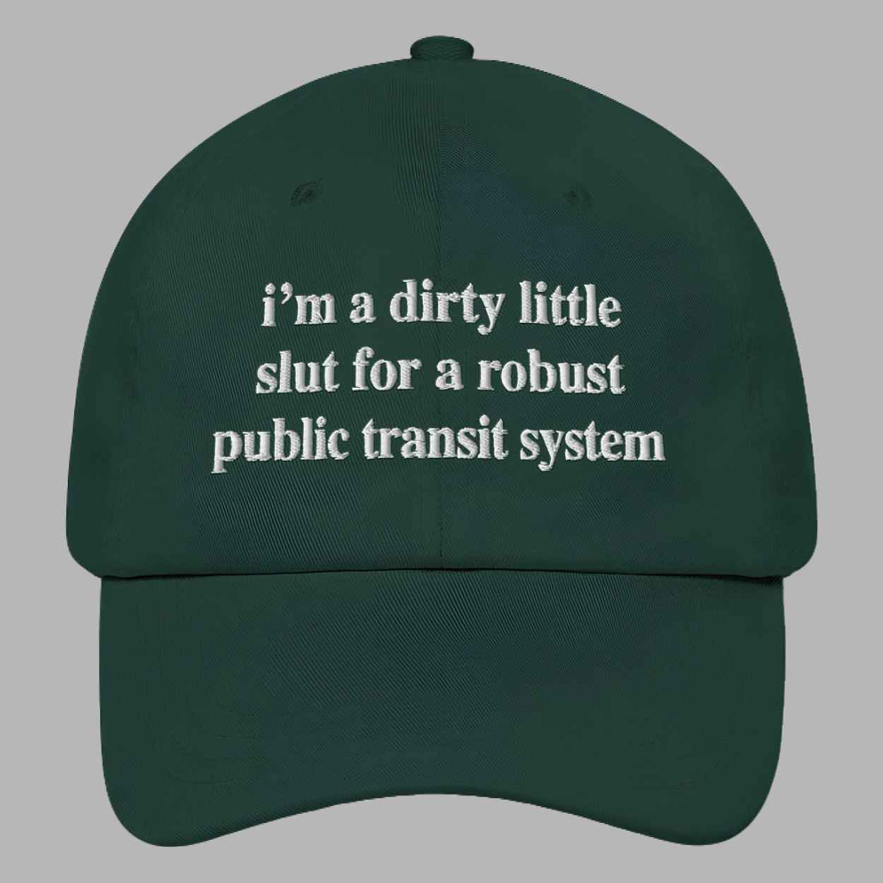 The I’m A Dirty Little Slut For A Robust Public Transit System Hat is more than just headwear—it’s a cheeky, satirical, and thought-provoking accessory that sparks conversations wherever you go. With its witty embroidered text, this hat combines humor and social commentary in one stylish piece. If you’re passionate about sustainable cities, progressive transit systems, or just love a good laugh, this hat was made for you.