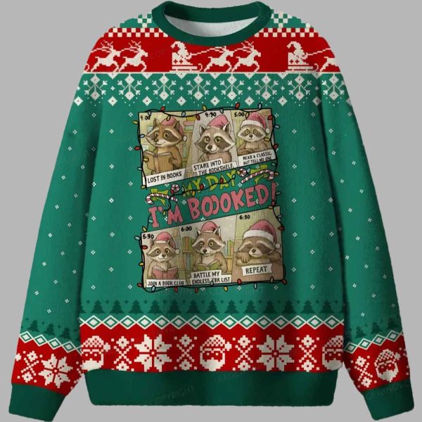 This spectacular sweater features a dominant, cheerful Christmas green base, beautifully contrasted by crisp white and vibrant red knit patterns, setting a cozy, festive scene. The centerpiece graphic is a hilarious, multi-panel comic strip detailing the entire evening schedule of a dedicated reader, represented by an adorable raccoon wearing a Santa hat. The schedule is hilariously over-committed to reading activities: 4:00 PM: Lost in Books; 4:30 PM: Stare into the Bookshelf; 5:00 PM: Read a Classic but Tell No One; 5:30 PM: Join a Book Club; 6:00 PM: Battle My Endless TBR List; 6:30 PM: Repeat. Above the calendar, the bold text delivers the perfect, witty punchline: “MY DAY IS BOOKED!” The entire design cleverly blends this self-aware, chaotic humor with traditional “ugly Christmas sweater” motifs. The sweater is framed by intricate borders of leaping reindeer, snowflakes, Christmas trees, and smiling Santa faces, all rendered in red and white. The contrast between the cozy, traditional knit aesthetic and the highly specific, intellectual humor is what makes the sweater so uniquely appealing. This sweater is far more than a simple novelty item; it’s a brilliant piece of visual comedy that validates the intense passion of book lovers, transforming the act of staying home to read into a celebrated, full-time commitment. It appeals to the wearer who possesses a sharp, self-aware sense of humor and uses irony to navigate the social pressures of the season, making it a comfortable, witty, and immediate symbol of self-care and literary devotion.