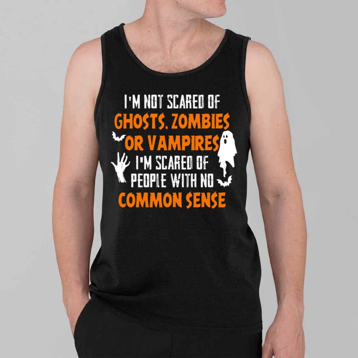 This classic black t-shirt features a bold, white print that delivers a clever message. The text “I’M NOT SCARED OF GHOSTS, ZOMBIES OR VAMPIRES” is prominently displayed, followed by a playful illustration of a ghost and bats. The punchline, “I’M SCARED OF PEOPLE WITH NO COMMON SENSE,” adds a humorous twist that’s both relatable and thought-provoking.