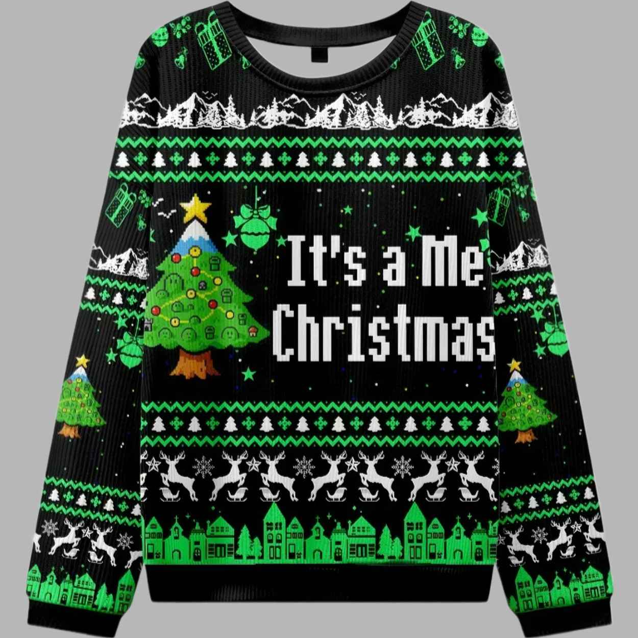 This striking black sweater features a dense pattern of green and white graphics, giving it a cool, stylized, pixelated look. The borders include festive elements like reindeer, snow-capped mountains, wrapped presents, and a snowy village scene, all rendered in a charmingly blocky style. The main graphic features a decorated Christmas tree next to the bold, white text that reads: “It’s a Me Christmas.” The design humorously adapts one of the most famous catchphrases in video game history, replacing the classic greeting with a holiday declaration. This garment transcends standard novelty wear by celebrating the joy of shared gaming culture and the ability of simple phrases to evoke powerful nostalgia. It symbolizes the spirit of playful self-reference and the fun of incorporating personal passions into seasonal celebrations.