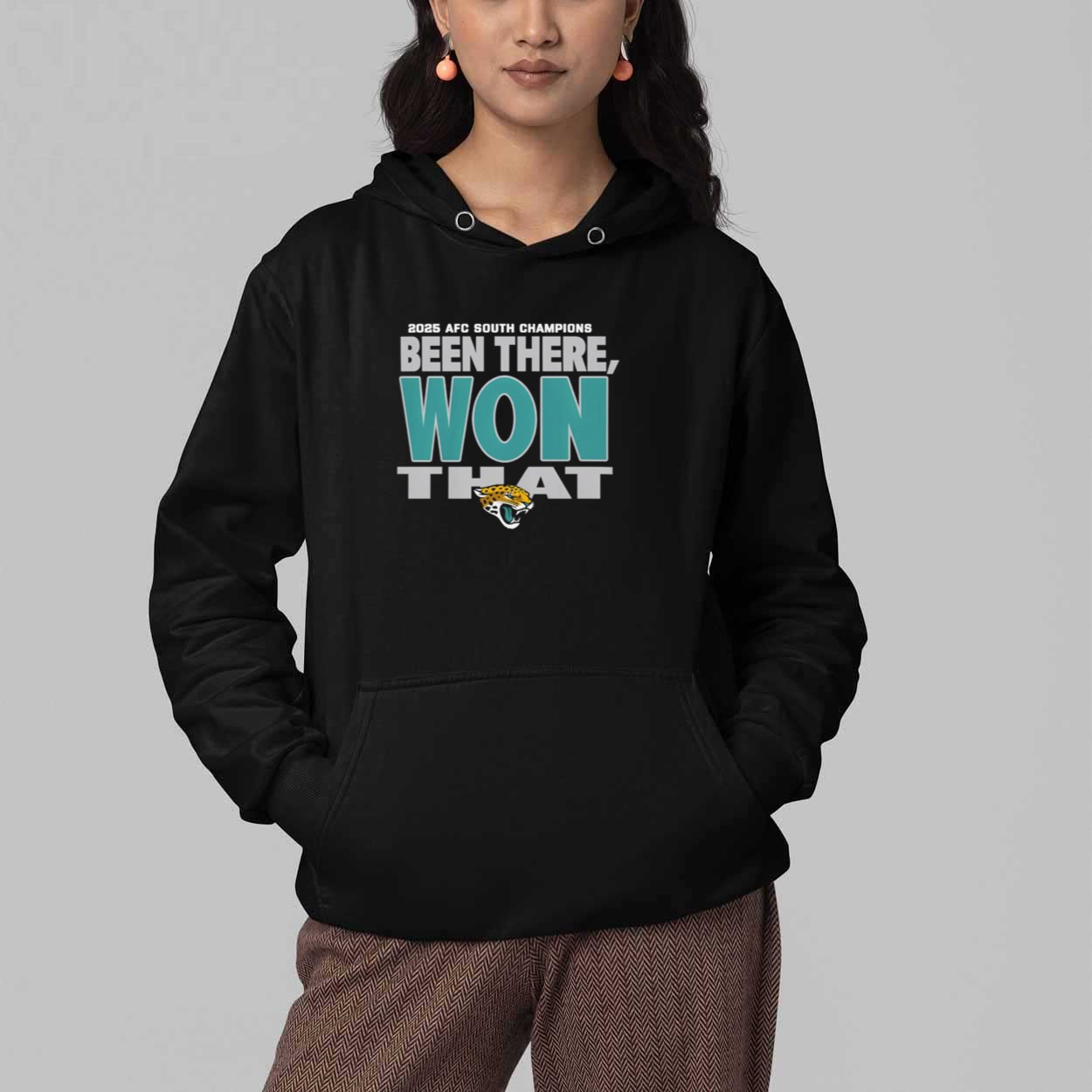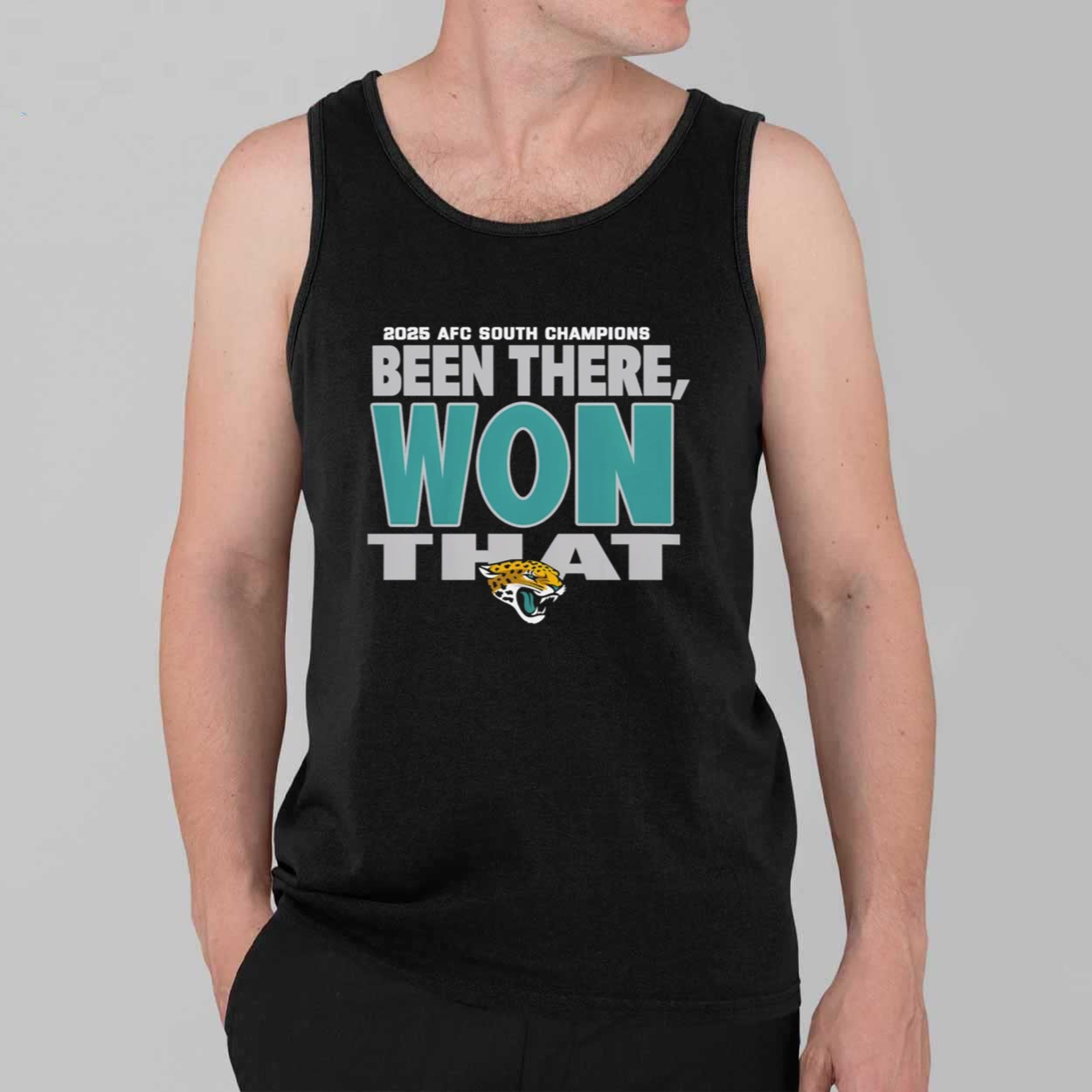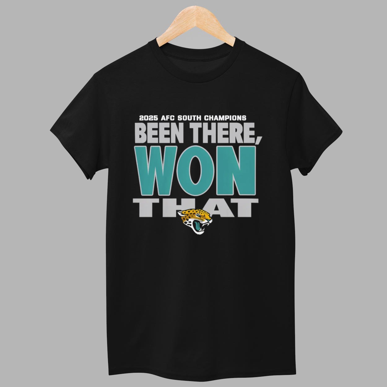 This black t-shirt features a high-impact typographic design that perfectly captures the bold spirit of a champion. The front is dominated by the defiant statement “BEEN THERE, WON THAT” in a striking combination of teal and silver-grey block lettering, anchored by the fierce team mascot. Above the main slogan, the “2025 AFC SOUTH CHAMPIONS” title serves as a permanent record of the most recent conquest. Beyond its sharp aesthetic, this garment represents the unwavering confidence of a fan base that has seen it all and a team that consistently delivers when the pressure is highest. It is a creative masterpiece designed for those who want their apparel to reflect a history of success and a future of continued excellence in the division.