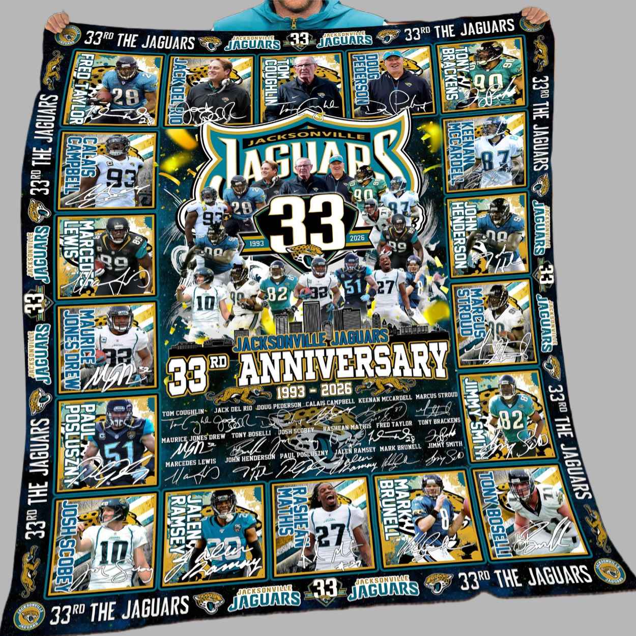 This blanket features a masterful collage design that serves as a visual timeline of the franchise’s journey from 1993 to 2026. The center is anchored by a triumphant 33rd-anniversary crest, surrounded by high-impact panels featuring legendary players and coaches like Fred Taylor, Mark Brunell, and Tom Coughlin, each accompanied by their signature. Beyond its striking aesthetic, this piece represents the evolution of a community and the enduring passion of a fanbase that has stood by the squad for thirty-three years. It is a creative masterpiece designed for those who want to preserve the legacy of their favorite icons and carry the warmth of a historic spirit into every corner of their home.