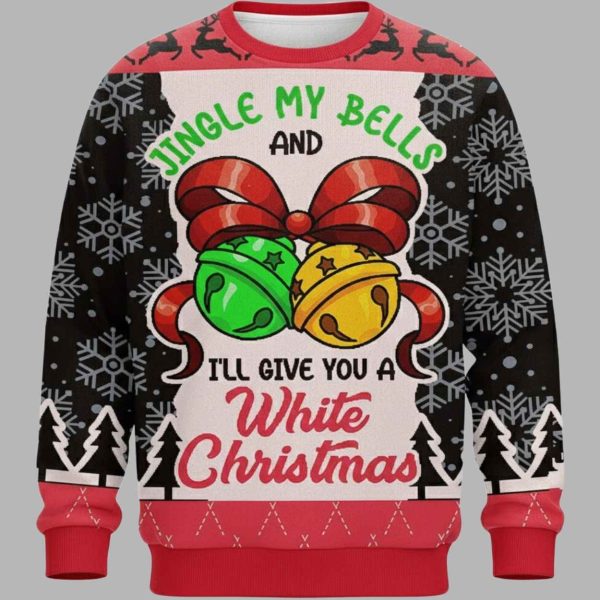 This eye-catching sweater features a dark background with traditional holiday patterns in red and white, including snowflakes, reindeer silhouettes, and Christmas trees. The centerpiece is a large, vibrant graphic of two holiday bells—one green and one yellow—tied together with a festive red bow. Above and below the bells is the unforgettable, witty phrase: “JINGLE MY BELLS AND I’LL GIVE YOU A White Christmas.” The design cleverly subverts a classic Christmas carol, transforming a wholesome tradition into a cheeky, double-entendre joke. This garment transcends standard holiday wear by providing a hilarious, adult commentary on the spirit of holiday fun and flirtation. It symbolizes the lighthearted, often mischievous side of celebrating the season, making it an excellent and memorable statement piece for adult gatherings.