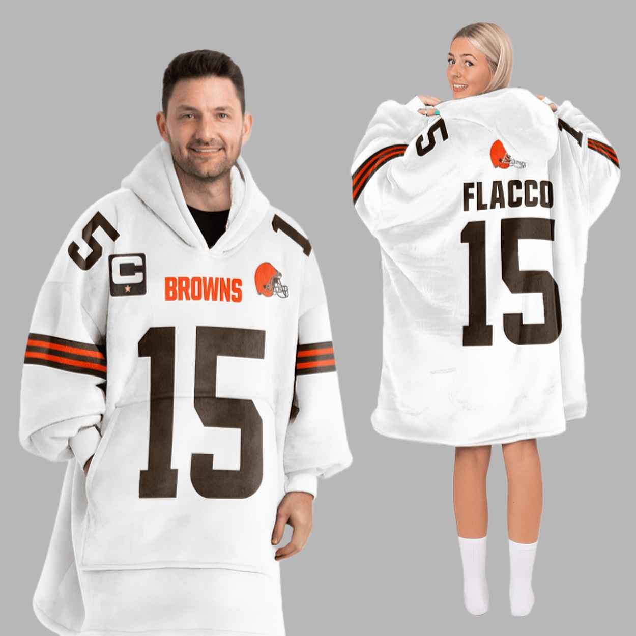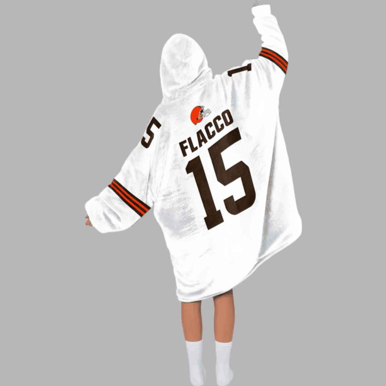 The “Joe Flacco 15 Cleveland Football Unisex Blanket Hoodie” is a revolutionary piece of fan apparel that brilliantly fuses the cozy warmth of a blanket with the style of an oversized hoodie. This massive, comfortable garment features a design inspired by the team’s jersey, prominently displaying the player’s name, “FLACCO,” and his distinctive number “15” in bold text and numerals on both the front and back. The classic team colors—white with brown and orange accents—are incorporated into the trim and lettering, ensuring immediate team recognition. This blanket hoodie transcends mere fan merchandise; it is a wearable celebration of the unexpected, high-energy success brought by the quarterback, symbolizing the comfort and excitement of watching a true competitor perform. It embodies the cozy ritual of watching the game at home, allowing you to wrap yourself in team spirit and plush softness. With its large hood, deep front pocket, and oversized fit, this item is perfect for ultimate relaxation, whether you’re on the couch, tailgating on a cold day, or simply enjoying a lazy weekend.