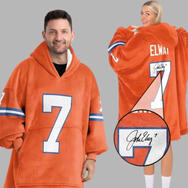 This unique garment takes the classic look of a football jersey and transforms it into a massive, oversized, incredibly soft blanket hoodie, designed for both men and women. The dominant color is a bold orange, instantly recognizable for any dedicated football fan. The front proudly features the large number “7,” and the back displays the name “ELWAY” above the number “7.” A special graphic element, a stylized representation of his signature, is prominently featured near the number on the back, adding a personalized, legendary touch. The garment includes an attached hood and a large front pocket for maximum comfort and utility. This blanket hoodie is more than just comfortable loungewear; it’s a wearable tribute to a champion and a storied franchise history. Its meaning is rooted in celebrating the grit, determination, and iconic moments delivered by a true football hero. Wearing this piece signifies a deep, unwavering team loyalty and an appreciation for the golden age of the franchise. It’s the perfect way to wrap yourself in the legacy of greatness while achieving supreme relaxation.