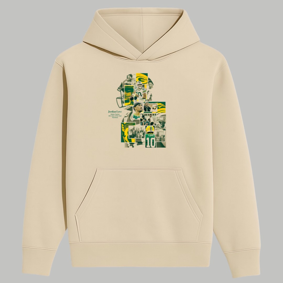 This sophisticated cream T-shirt is a stunning tribute to a player whose character and contributions extend beyond the game. The design features a dynamic, artistic collage of photos showcasing the player’s talent, dedication, and community involvement, all encapsulated within the iconic team colors of green and gold. Prominently featured are images of the player in action, the team helmet, and a callout highlighting the achievement: “NFL Man of the Year Nominee.” This shirt represents admiration for athletic excellence and, more importantly, respect for the positive difference the player makes in the wider community. It is a piece of apparel that celebrates leadership, philanthropy, and the highest standards of sportsmanship.