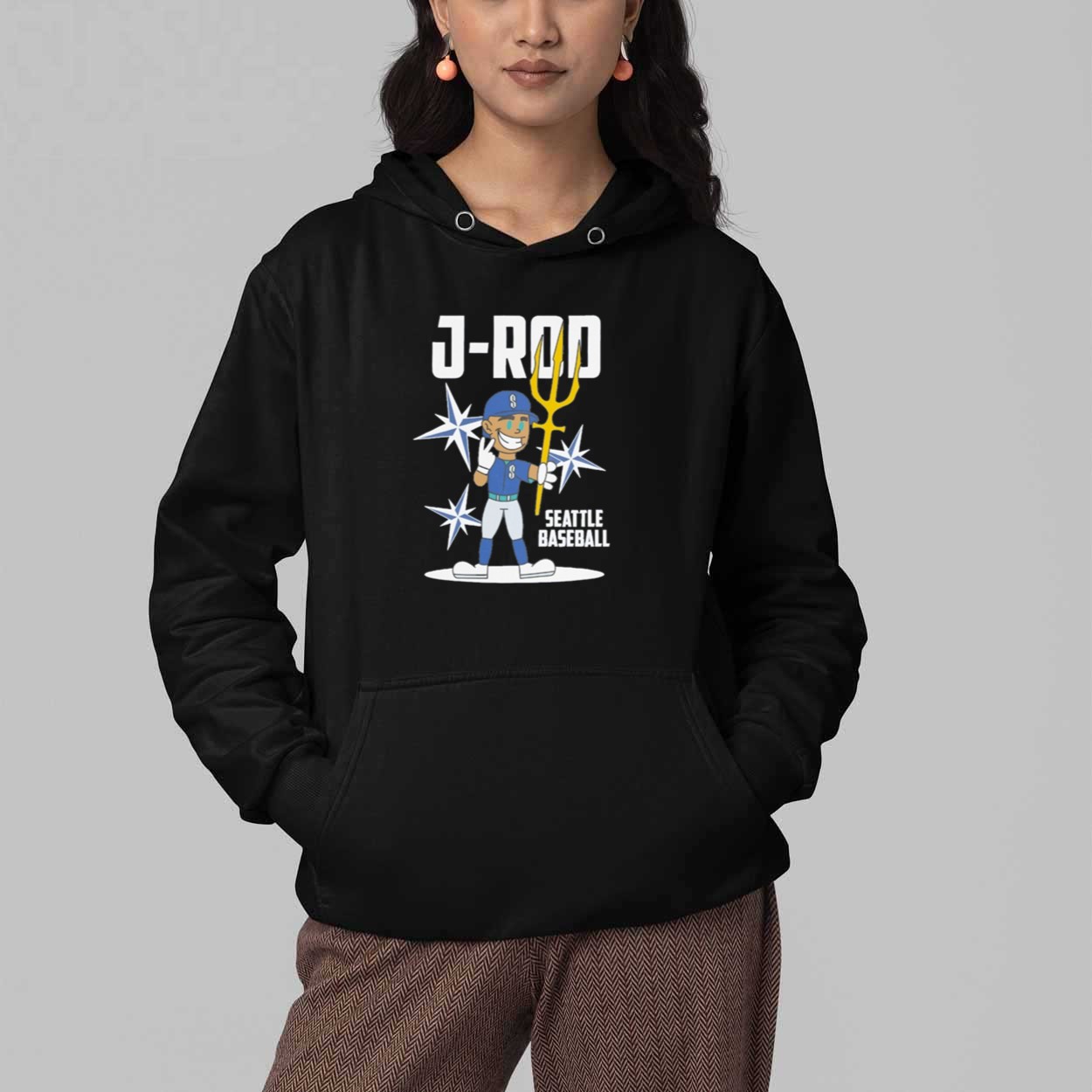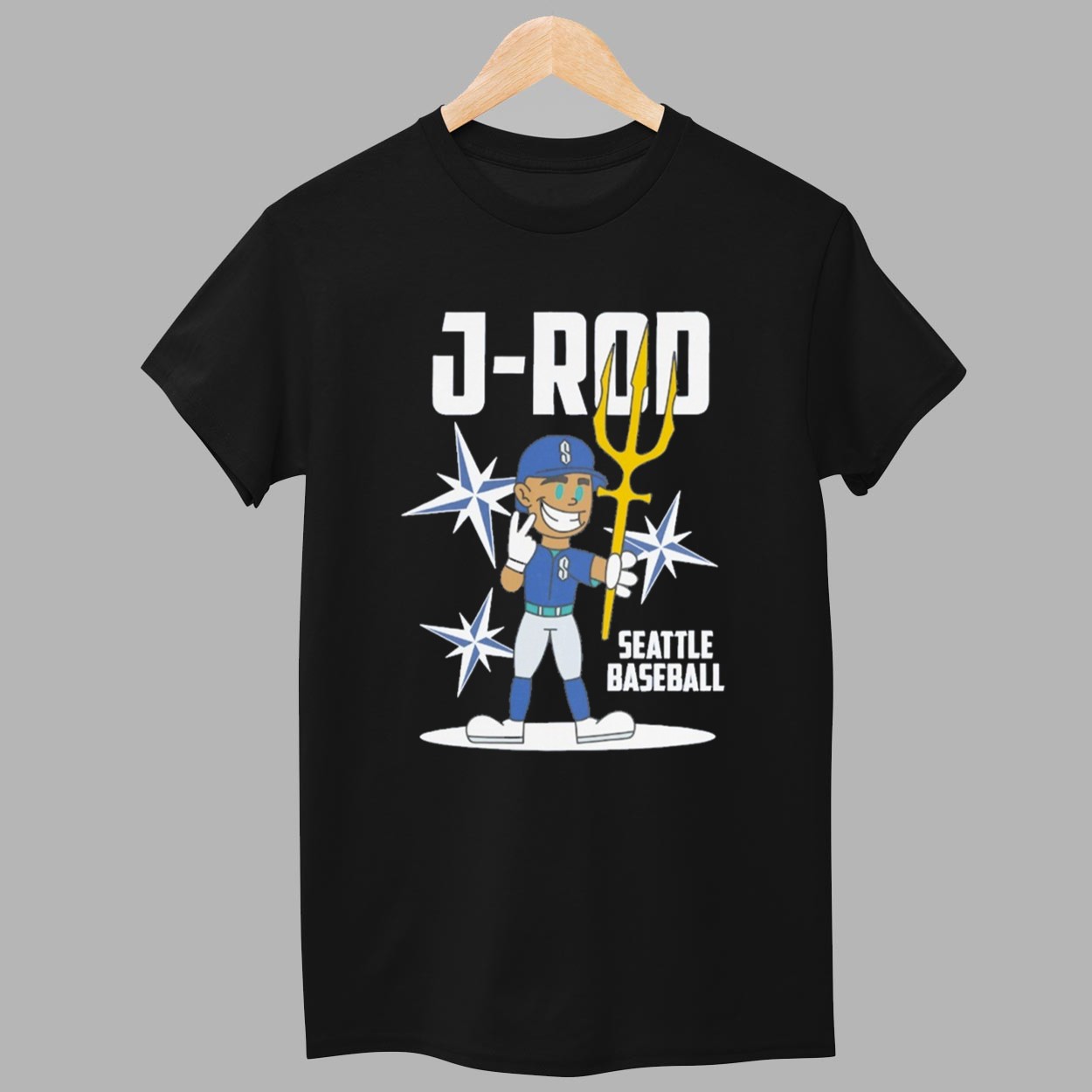 The front of the shirt features a powerful and stylish graphic, reminiscent of a fun cartoon. A dynamic, action-packed drawing of a triumphant Julio Rodríguez is shown, holding a majestic trident—a symbol of the team’s “Kraken” identity. The bold text “J-ROD” is prominently displayed, a direct reference to his famous nickname, with the text “SEATTLE BASEBALL” below it, celebrating his team and his city. This shirt serves as a tribute to Julio Rodríguez’s status as a superstar and a franchise player for the Seattle Mariners. It commemorates the feeling of pride that every fan feels when a player of his caliber takes the field, and it’s a wearable symbol of a fan’s belief in his leadership and the thrilling excitement he brings to every game.