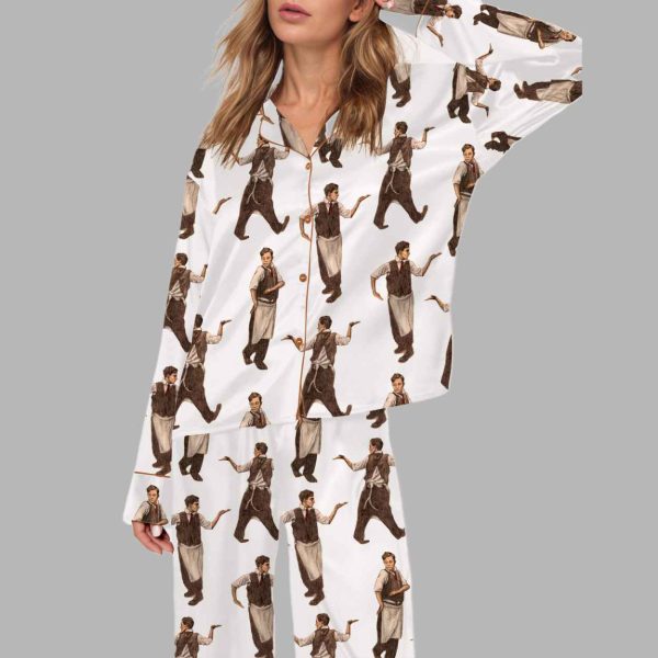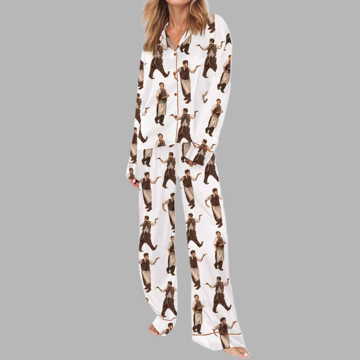 This elegant pajama set features a crisp white fabric covered in a repeated pattern of vintage-style illustrations of a formally dressed man in an apron, possibly a waiter or shopkeeper, posing in various theatrical stances. The figures, rendered in sepia tones, lend a quirky, antique charm to the contemporary cut of the pajamas. Details like the brown piping and buttons enhance the classic, structured look of the shirt and pants. This garment transcends standard sleepwear by celebrating the intersection of fine art illustration and modern comfort. It embodies a playful sense of eccentricity and sophistication, offering a nightly escape into a world of whimsical, vintage narratives while providing the ultimate in fluid, non-constricting relaxation.