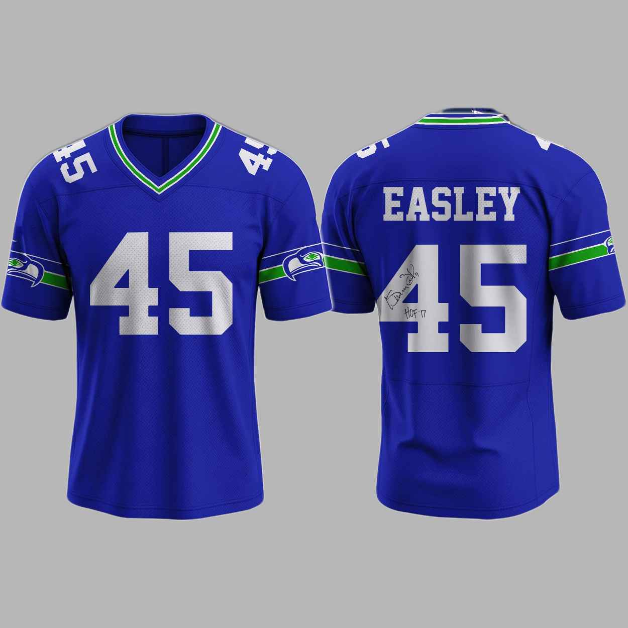 This commemorative jersey is designed with dignity and powerful clarity, reflecting the spirit of a legendary player. The foundation is a bold, electric royal blue, the signature color of the Seattle team. The classic V-neck jersey features white and green trim, with the team’s subtle logo prominently displayed on the sleeves. The front is dominated by the large number “45” in white. The back of the jersey is dedicated to honoring the player’s enduring memory. The name “EASLEY” is displayed across the shoulders, positioned above the large number “45”. A powerful, heartfelt detail is included beneath the number: a facsimile of his signature, accompanied by the HOF ’17 (Hall of Fame 2017) inscription, transforming the jersey into a personalized tribute to his highest achievement and lasting impact. The shirt’s title, “Kenny Easley 1959-2025 Thank For Memories Jersey,” frames this item as a piece of commemorative fan history, acknowledging the dates associated with the life and enduring career of the player. This jersey is far more than just sportswear; it’s a wearable symbol of admiration, respect, and the deep, emotional connection fans feel to players who have left an indelible mark on the sport. It embodies the player’s fierce defensive spirit and his permanent place within the team’s history, making it a comfortable, high-impact, and immediate symbol of unwavering loyalty and gratitude.
