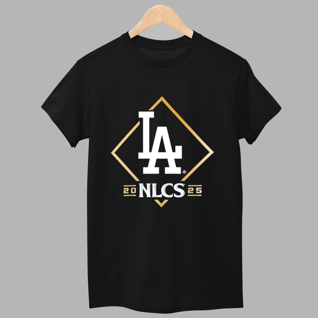 This sharp black t-shirt is a clean, modern tribute to the team’s elite postseason achievement. The design features the iconic “LA” logo in crisp white, centered within a striking gold diamond motif. Below this symbol of excellence, the bold text “20 NLCS 25” proudly proclaims the year and the high-stakes stage of the playoff run. The meaning of this design is rooted in celebration, prestige, and elite status. It transforms the shirt into a wearable commitment to the team’s greatness, symbolizing the achievement of reaching the league’s final four. The clean, high-contrast black-and-white graphic, accented by the gold diamond, signifies both power and aspiration for the ultimate championship.