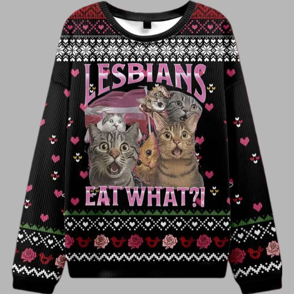 This spectacularly unique sweater is a phenomenal, statement-making addition to the ugly Christmas sweater tradition, designed for those who appreciate pop culture humor and bold self-expression. The captivating center graphic features a hilarious collage of wide-eyed, expressive cats looking surprised, framed by a banner in lesbian pride colors. Above and below this funny feline council, the bold, unforgettable text delivers the punchline: “LESBIANS EAT WHAT?!” The entire dynamic scene is set against a dark black, ribbed background and is framed by intricate fair isle-inspired borders featuring repeating motifs of pink hearts, roses, and snowflakes. This garment is far more than just holiday apparel; it’s a brilliant, humorous symbol of inclusivity, finding community, and embracing the joy of shared, specific humor. It’s an ideal way to showcase your witty, unique personality and inject some unforgettable, laugh-out-loud charm into any Christmas or holiday gathering.