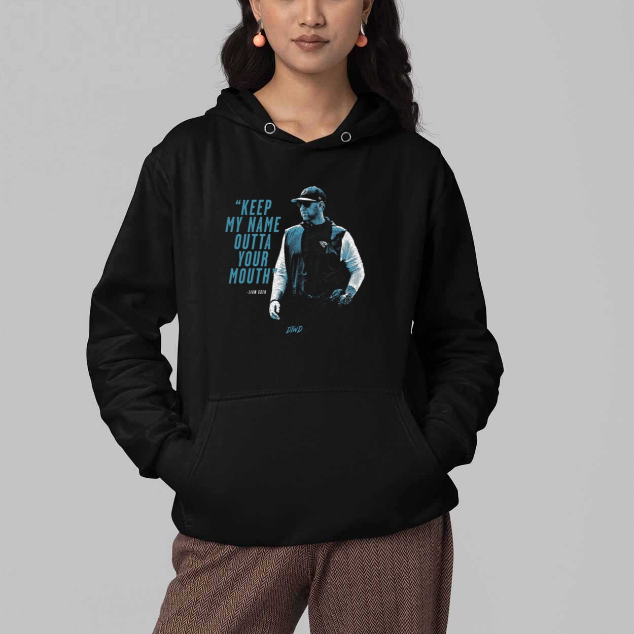 The front of the shirt features a powerful graphic: a bold, stylized portrait of Coach Liam Coen with his arms crossed, projecting confidence. The key message is emblazoned next to him in a strong, blue and white font: “KEEP MY NAME OUTTA YOUR MOUTH.” This shirt commemorates a viral moment in Coach Coen’s career, where this definitive statement was used to dismiss critics and refocus the energy on the team. The image, complete with the subtle initials “DTWD” (likely representing “Do The Work Daily” or a similar team mantra), makes this shirt a tangible symbol of his intense, relentless coaching philosophy and his demand for respect.