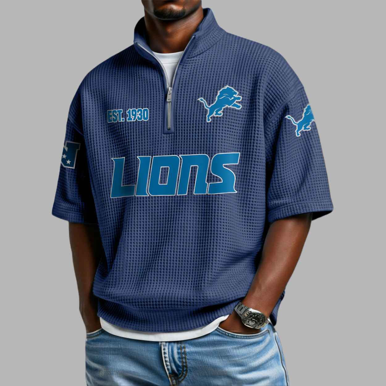 This textured navy blue quarter-zip shirt features a modern waffle-knit aesthetic that perfectly highlights the team’s iconic silver and blue accents. The chest proudly displays the fierce leaping lion logo alongside the historic “EST. 1930” founding date, while bold “LIONS” typography anchors the central design. This apparel is more than just a stylish top; it is a visual tribute to the resilience and deep-rooted traditions of the Detroit community. Every detail, from the additional team emblems on the sleeves to the clean zip-up neckline, represents a connection to a long-standing heritage of passion and the relentless spirit of the Motor City. It is a refined way to wear your pride and honor a legacy that has unified dedicated supporters for generations.