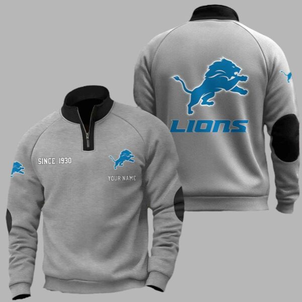 This premium heather grey sweatshirt features a structured black quarter-zip collar and matching reinforced elbow patches that add a touch of modern utility to a classic design. The chest is detailed with the historic “SINCE 1930” founding year alongside the iconic leaping lion logo, while the back displays a massive, high-definition team emblem and bold “LIONS” typography. Beyond its stylish appearance, this garment serves as a wearable tribute to the resilience and deep-rooted traditions of the Detroit community. Every detail, from the clean silhouette to the personalized “Your Name” feature, represents a unique connection to a heritage of passion that has unified dedicated supporters for generations.