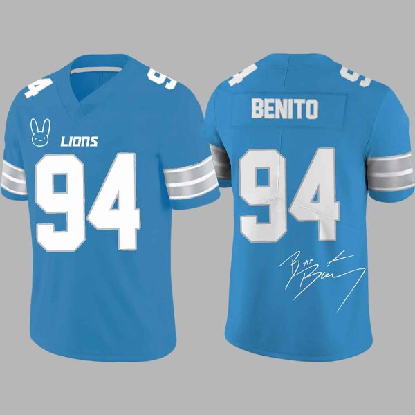 The jersey has a classic athletic cut. The front proudly displays the Lions wordmark and logo alongside the artist’s famous bunny ears logo, emphasizing the collaboration. The large, dominant numbers “94” are featured prominently in white. The back of the jersey features the same large number 94 and the name “BENITO” (Bad Bunny’s birth name) across the shoulders. A special design element is the replica of Bad Bunny’s signature printed below the number. This jersey commemorates the incredible cultural moment when a major NFL franchise and a global music superstar connected, appealing to a massive, combined fanbase. The Lions x Bad Bunny Jersey design, particularly the use of Benito’s name and signature, became instantly recognizable after it was unofficially conceived by fans following Bad Bunny’s record-breaking tours and his influence on sports fashion, serving as the ultimate piece of mash-up gear for those who champion both their team and their favorite artist.