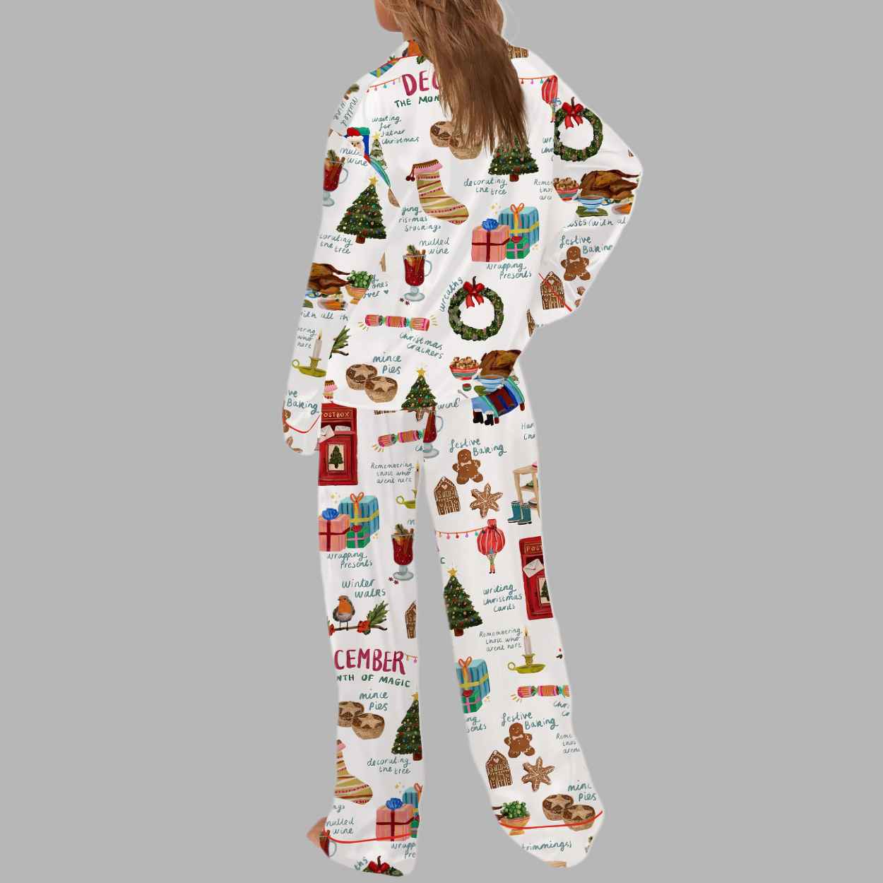 The “Loveliest Time Of Year Silky Satin Pajama Set” is a sophisticated two-piece sleepwear ensemble that flawlessly blends the smooth, cool touch of satin with a dense, charming, and highly detailed collage of classic December traditions. The crisp white fabric is covered in a beautiful, hand-drawn style pattern featuring a humorous visual checklist of everything that makes the season special. The motifs include illustrations of festive baking (gingerbread men), decorating the tree, roasting dinner, hanging stockings, wrapping presents, enjoying mulled wine, and even tiny Santas and winter boots. Anchoring this entire scene is the prominent header “DECEMBER: THE MONTH OF MAGIC” alongside brief, descriptive phrases for each activity. This dense, joyful motif transforms sleepwear into a unique, wearable celebration of the cozy, domestic side of the holiday season. It symbolizes the wearer’s love for festive rituals, the comfort of home, and the gentle, magical chaos of December. The luxurious sheen of the satin and the long-sleeve, button-down design, neatly framed by contrasting red piping, elevate this whimsical theme into a chic, high-quality garment. This set is more than just comfortable; it’s a visual tribute to the cozy, sophisticated side of holiday indulgence.