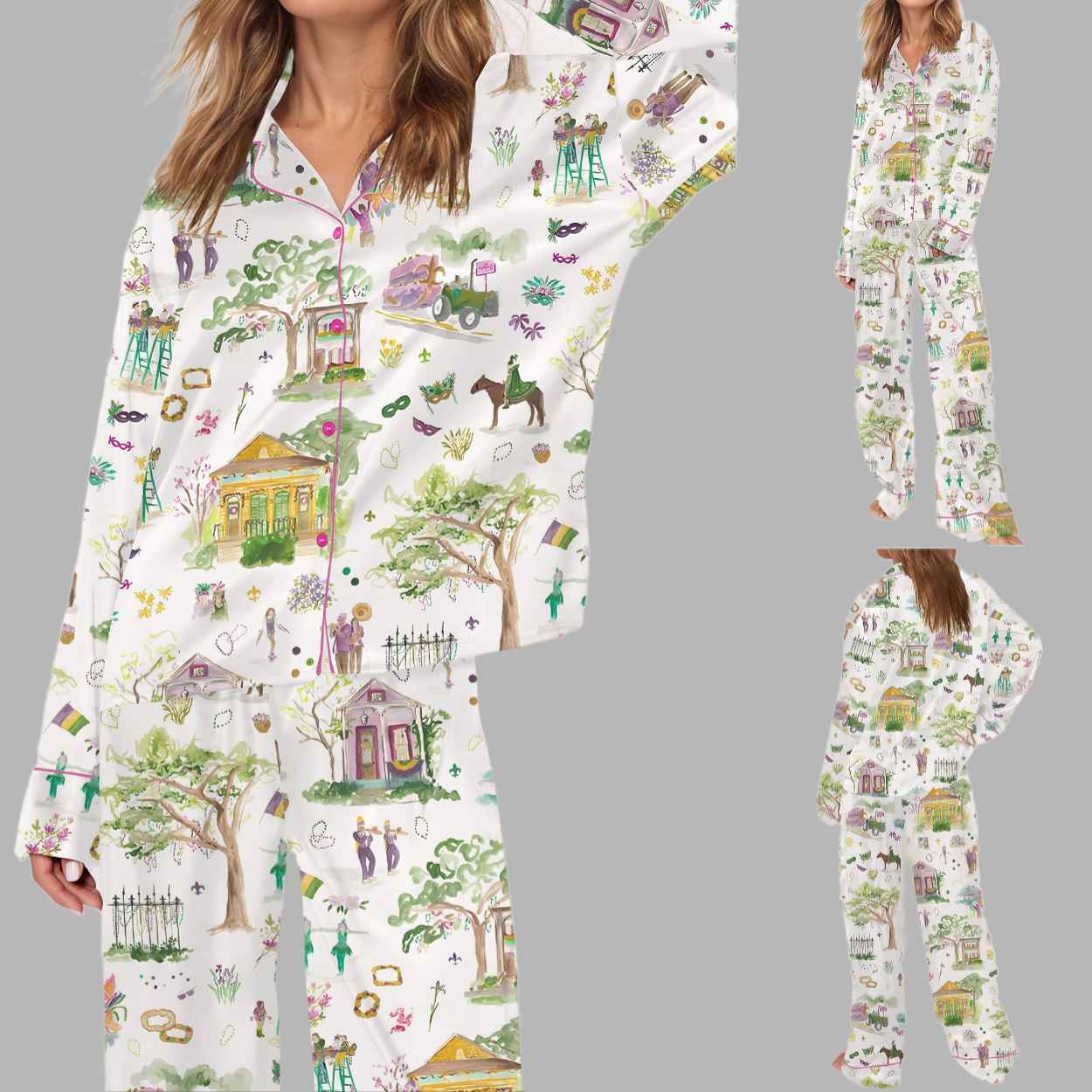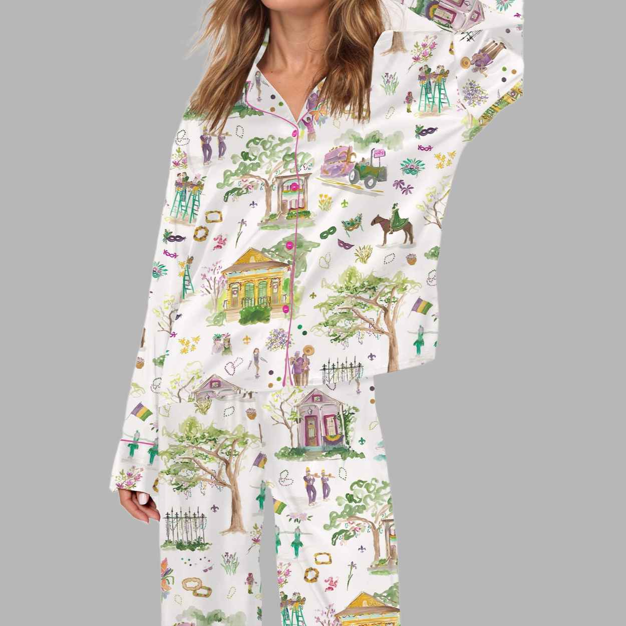 This elegant two-piece set features a classic button-down top with a refined collar and matching long trousers, all draped in a stunning hand-painted style illustration. The design captures the heart of a world-famous celebration, showcasing whimsical scenes of garden district architecture, festive parade floats, masked revelers, and lush southern greenery. Beyond its stylish appearance, this apparel serves as a wearable celebration of culture and joy, inviting you to embrace the tradition of the carnival season every time you wind down. Every detail, from the bright pink buttons to the intricate sketches of jazz musicians and blooming flowers, is designed to transport you to the lively streets of the French Quarter. It is a perfect blend of artistic storytelling and sophisticated loungewear, making your nighttime routine feel like a grand celebration.