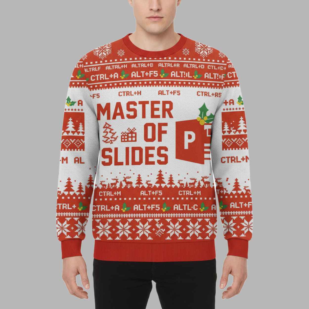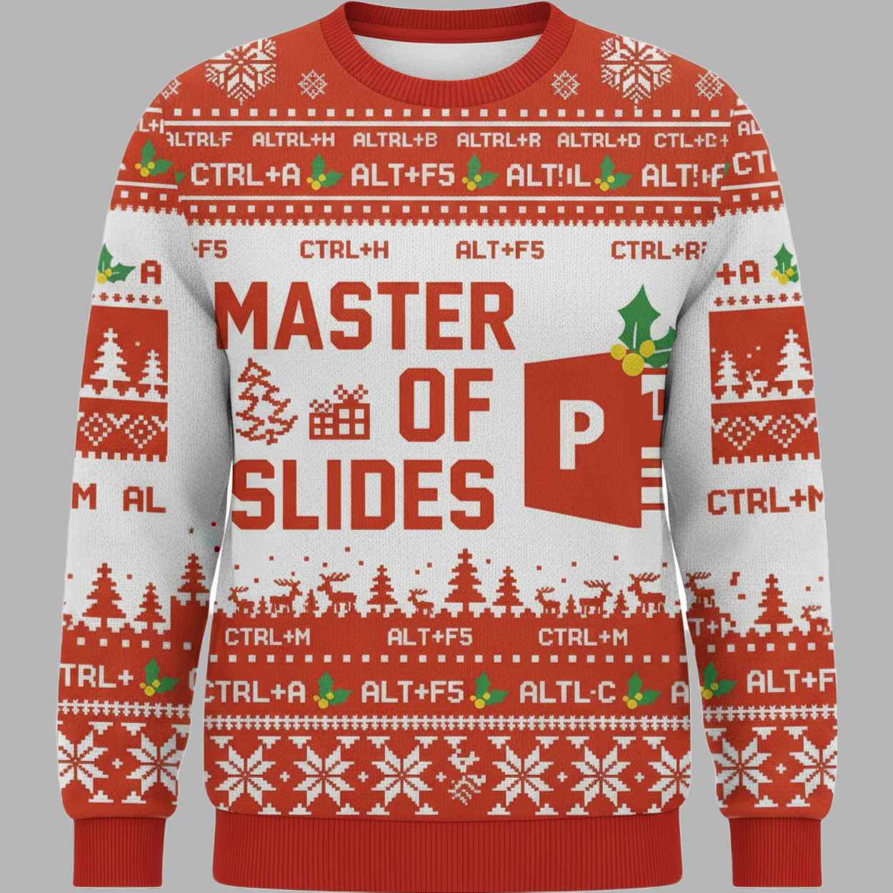 This bright, red and white sweater cleverly merges classic holiday patterns with iconic tech culture. The traditional Christmas elements—snowflakes, reindeer, and festive borders—are infused with a distinctive, professional twist. Dominating the chest is the phrase “MASTER OF SLIDES” alongside a festive, holly-adorned graphic nod to the famous presentation software icon. The true brilliance lies in the intricate borders, which are patterned not with simple geometrics, but with a series of highly recognizable keyboard shortcuts like $CTRL+A$, $ALT+F5$, $CTRL+M$, and $ALT+L$. This design means more than just a funny graphic; it’s a badge of honor for anyone in the corporate or academic world who spends their days behind a screen. It signifies a playful acknowledgment of the daily grind and the essential, often unsung, skills required to manage, teach, or sell. Wearing this sweater is a way of saying, “I work hard, but I also know how to celebrate,” making your professional prowess part of your festive identity. It’s the perfect attire for bringing a little bit of the boardroom to the holiday party, turning tedious tasks into cheerful novelty.