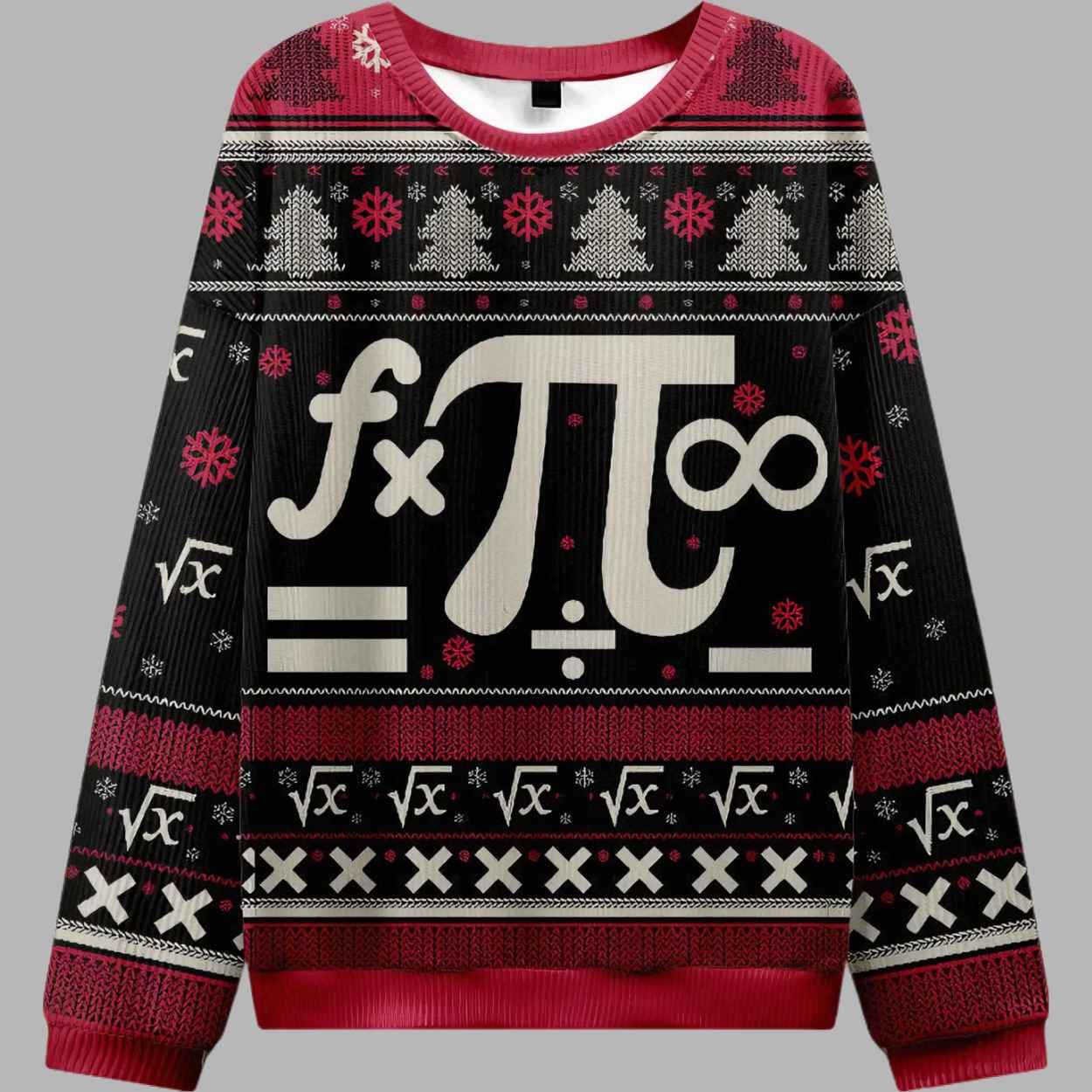 The sweater’s design is a fun and modern take on the classic “ugly Christmas sweater.” It features a festive black and red color scheme with a pixelated pattern of snowflakes and Christmas trees. The central graphic is a whimsical collection of mathematical symbols, arranged to form a large Pi symbol. The design is also peppered with square root symbols and other math operators, a nod to the shared experience of solving equations. This sweater serves as a piece of commemorative apparel for the rise of geeky humor and the universal love for a good challenge. It perfectly captures the joy of celebrating a unique passion during a time meant for joy and sharing.