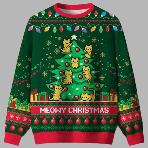 The “Meowy Christmas Ugly Christmas Sweater” is a vibrant, cozy pullover that flawlessly fuses traditional holiday knitwear with irresistible animal humor. The sweater features a bold, classic green and red color palette, framed by traditional “ugly sweater” Fair Isle patterns, bright string lights, and wrapping paper-styled graphics. The centerpiece delivers the ultimate, delightful visual: a brightly decorated Christmas tree that has been completely conquered by a group of cheerful, cartoon cats. The kittens are perched among the ornaments, climbing the branches, and lounging beneath the star, perfectly embodying the chaotic reality of having a cat during the holidays. Below this scene of feline festive mayhem, the bold text proclaims the perfect holiday pun: “MEOWY CHRISTMAS.” This design is a masterstroke of whimsical comedy, perfectly capturing the cat’s inherent, adorable mischief and transforming the tree into a playground. It subverts the traditional focus on pristine perfection with a blast of delightful, relatable charm, symbolizing the wearer’s fun-loving spirit and their appreciation for the quirky, untamed side of life. It’s a warm, comfortable, and immediately eye-catching piece that is perfect for the cat owner, the animal enthusiast, or anyone ready to be the center of a cheerful, chaotic, and heartwarming holiday conversation.