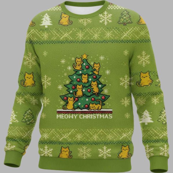 This spectacular sweater features a dominant, cheerful lime-green base, setting a bright and playful festive scene. The centerpiece graphic is an utterly charming and chaotic image: a perfectly decorated Christmas tree completely taken over by several cute, golden-yellow cats. The cats are seen lounging on the branches, sitting atop the star, and generally treating the tree as their personal jungle gym—a scene highly relatable to any cat owner! Below this delightful display, the text delivers the ultimate holiday cat pun: “MEOWY CHRISTMAS”. The entire design cleverly blends this witty, self-aware humor with traditional “ugly Christmas sweater” motifs. The sweater is framed by intricate borders of pixelated snowflakes, small Christmas trees, and repeating silhouettes of sitting cats, all rendered in shades of yellow and white. The combination of the cozy, traditional knit aesthetic and the highly specific, comforting humor of the “Cat Tree” theme is what makes the sweater so uniquely appealing. This sweater is far more than a simple novelty item; it’s a brilliant piece of visual comedy that validates the universal truth of cats and Christmas trees—they are magnets for each other. It speaks to the wearer who possesses a sharp, self-aware sense of humor, appreciates cozy comfort, and finds a familiar, chaotic joy in their beloved pets, making it a comfortable, witty, and immediate symbol of feline devotion and festive fun.