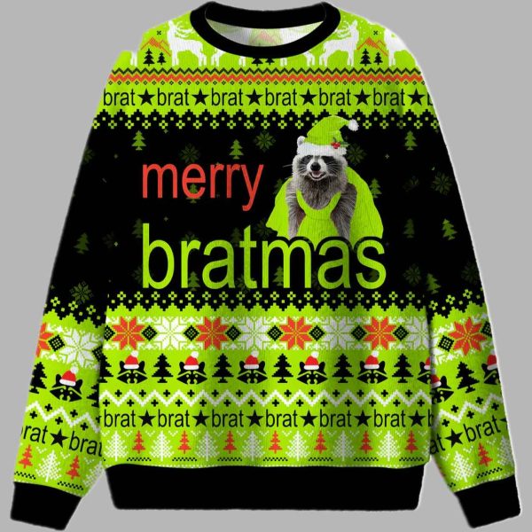 The “Merry Bratmas Ugly Christmas Sweater” is a bold, high-contrast pullover that gleefully embraces the “bad influence” side of the holiday season. The sweater features a dramatic black and neon lime-green color palette, framed by traditional yet subversive Fair Isle patterns that include reindeer, Christmas trees, and a repeated banner of the word “brat.” The centerpiece of the design is a charmingly defiant raccoon, the ultimate “trash panda,” wearing a bright lime-green hoodie and a Santa hat, staring out with mischievous confidence. This image is flanked by the bold, festive text: “merry bratmas.” This design is a humorous, self-aware celebration of non-conformity and cheeky rebellion, transforming the sweater into a statement of playful, spirited defiance. It symbolizes the wearer’s refusal to conform to overly saccharine holiday expectations, instead choosing a path of fun, slightly chaotic, and utterly unforgettable cheer. It’s a warm, comfortable, and immediately eye-catching piece that is perfect for the prankster, the free spirit, or anyone who knows that sometimes, the best holiday memories are the ones that involve a little bit of trouble.