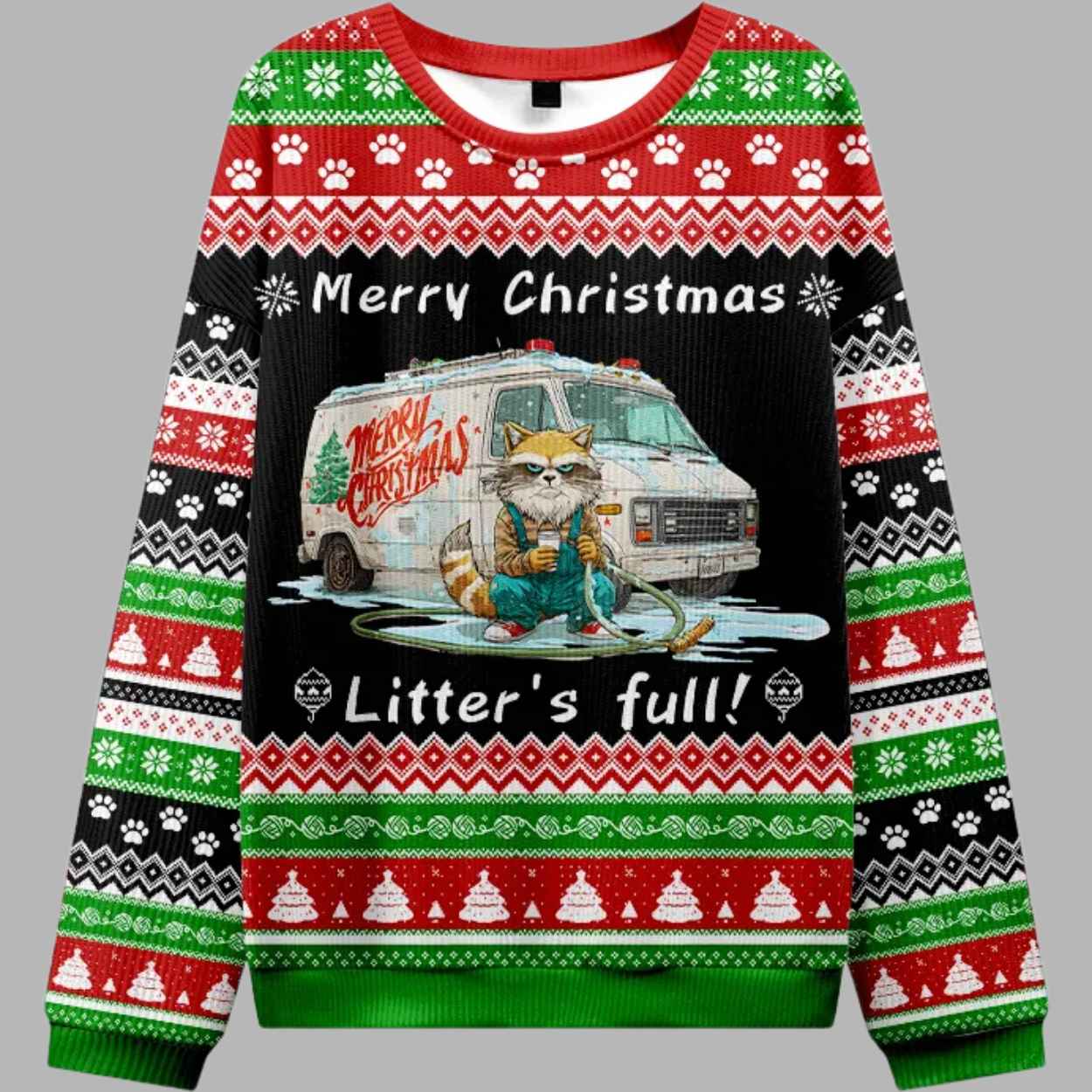 This spectacular sweater features a dominant, high-contrast color scheme of deep black, bright Christmas red, and vibrant green, instantly setting a festive and edgy scene. The centerpiece graphic is a brilliant, absurd, and instantly relatable image of a raccoon—the ultimate “trash panda”—dressed in overalls, squatting outside a dilapidated van (perhaps a carpet cleaning service van, ironically decorated with a “Merry Christmas” sign). The raccoon holds a hose or cleaning tool with a look of resigned determination. Above the scene, the bold white text declares: “Merry Christmas”, and below, the punchline delivers the blunt, chaotic truth: “Litter’s full!” The entire design cleverly blends this self-aware, chaotic humor with traditional “ugly Christmas sweater” motifs. The background and borders feature intricate rows of white paw prints, geometric zigzags, repeating Christmas trees, and snowflakes, all rendered in the festive colors. The juxtaposition of the cozy, traditional knit aesthetic and the highly specific, chaotic image of the raccoon dealing with a full load of “litter” is what makes the sweater so uniquely funny. This sweater is far more than a simple novelty item; it’s a brilliant piece of visual comedy that validates the universal feeling of dealing with a lot during the holiday season—whether it’s literal trash, family drama, or a never-ending to-do list. It speaks to the wearer who possesses a sharp, self-aware sense of humor and uses irony to cope, transforming the struggle into a comfortable, witty, and immediate symbol of relatable resilience.