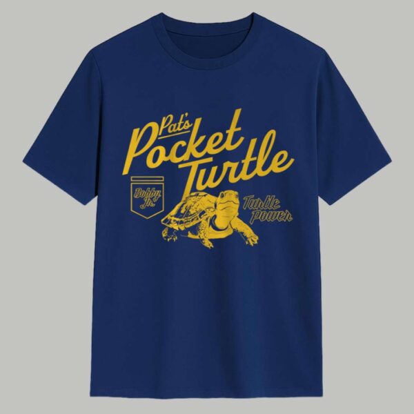 - Dynamic Typography: Features the phrase “Pat’s Pocket Turtle” in a bold, slanted golden-yellow script that pops against the navy background.