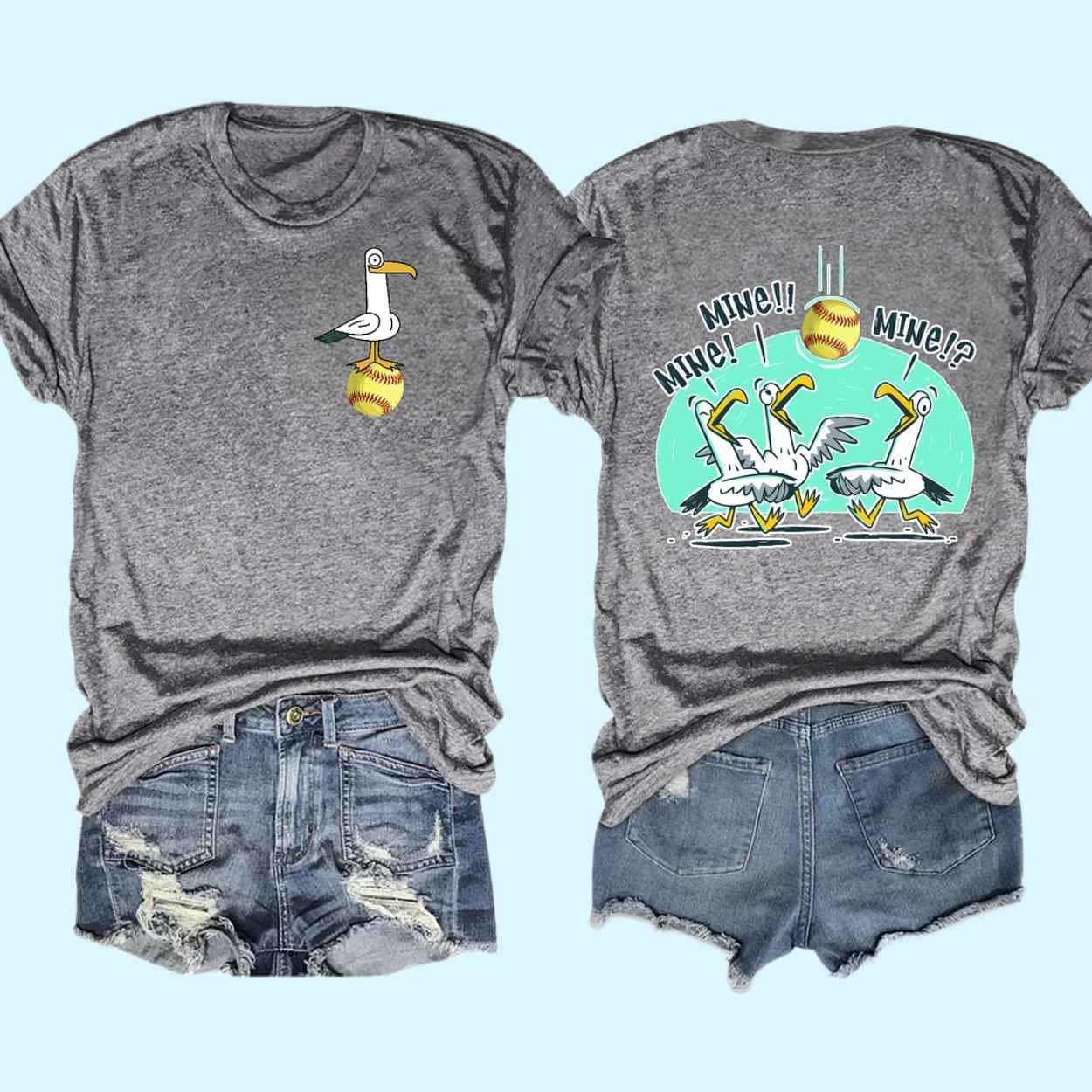 - Pocket-Style Front Graphic: Features a single, quirky seagull perched confidently on top of a yellow softball on the left chest.