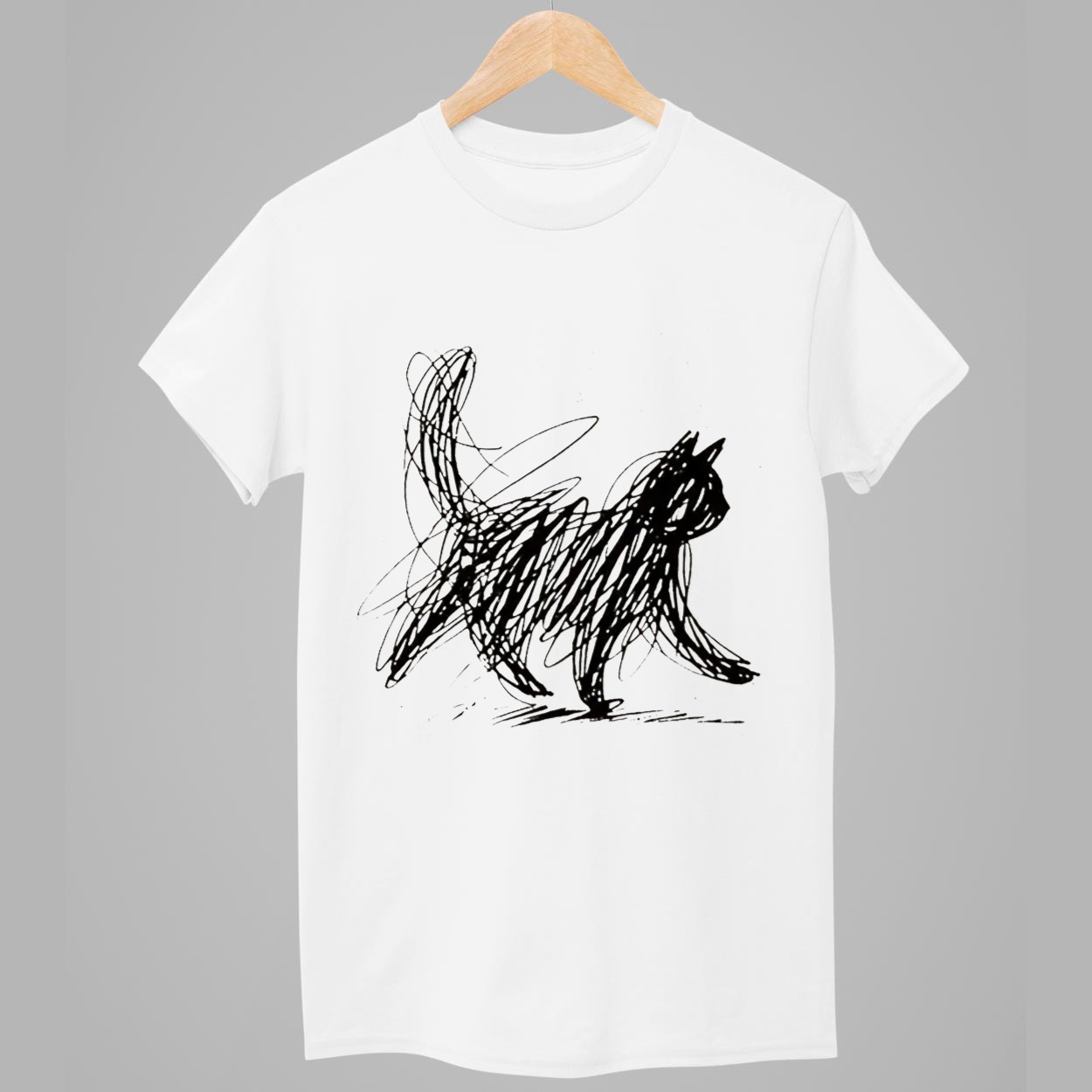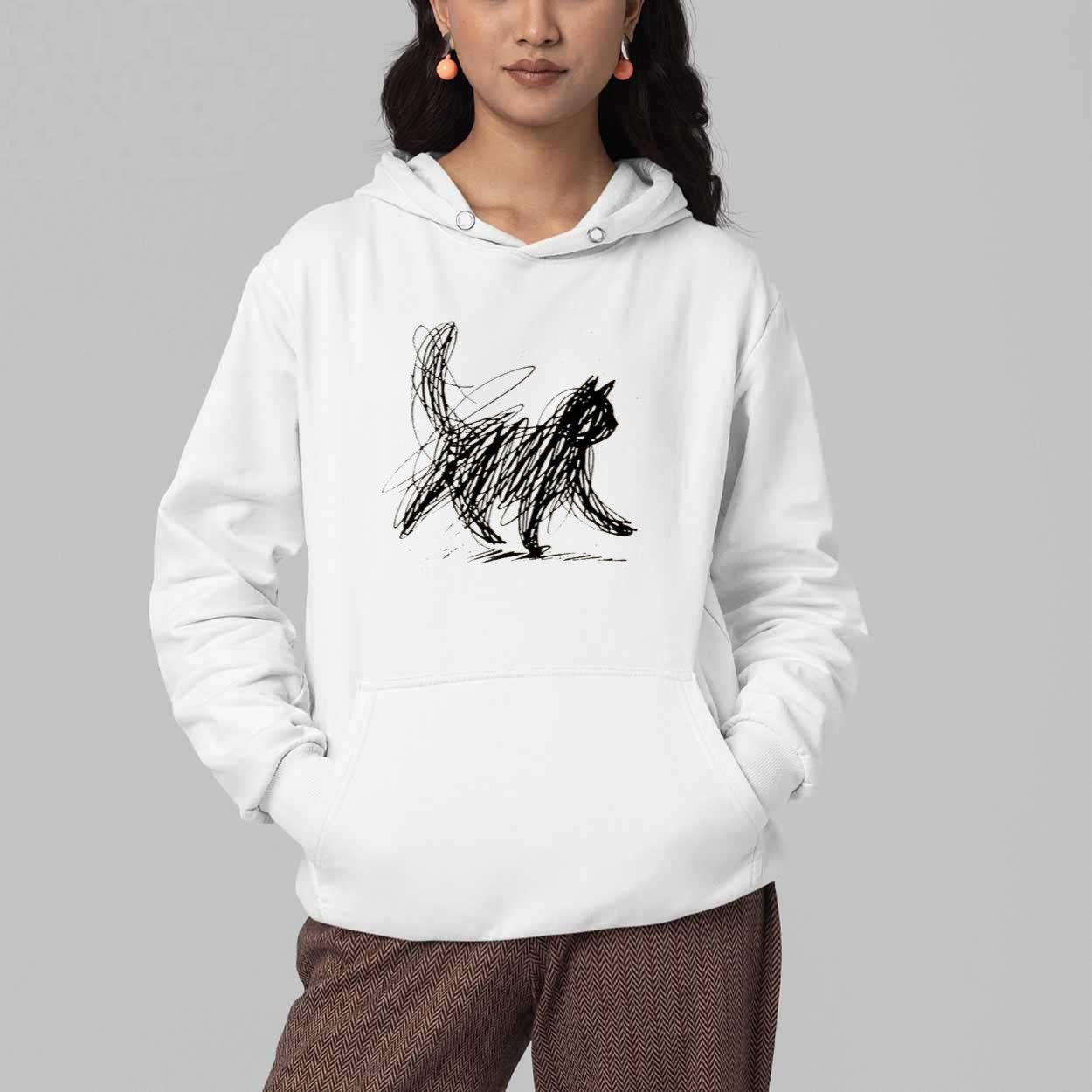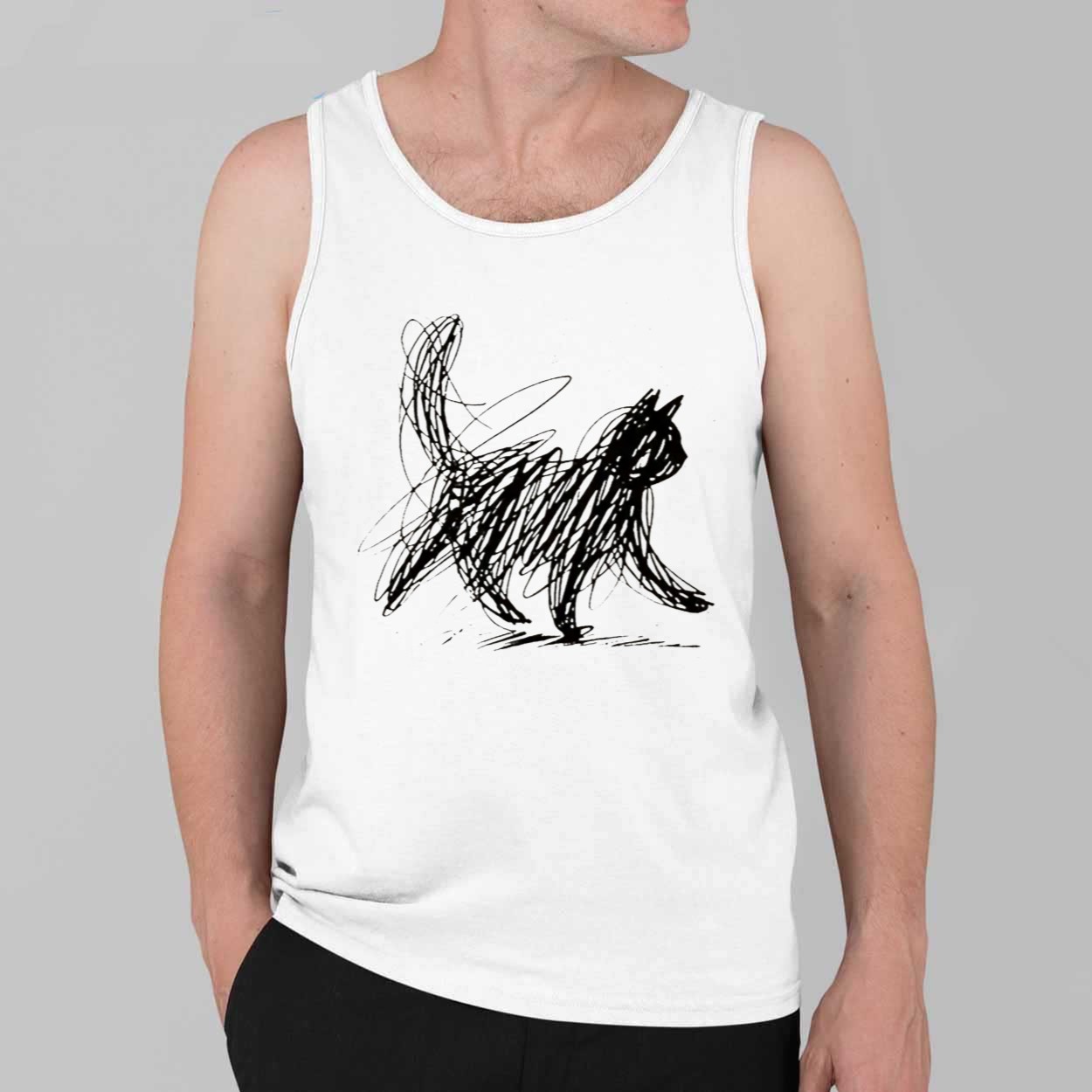 This white t-shirt features a captivating hand-drawn scribble illustration of a cat in motion, capturing the playful and unpredictable energy of our favorite companions. The black ink-style artwork uses chaotic yet deliberate lines to form a sophisticated silhouette, turning a simple concept into a bold piece of wearable art. Beyond its visual appeal, this garment represents the beautiful complexity of a cat’s personality—mysterious, energetic, and completely unique. It is a creative masterpiece designed for those who appreciate modern, abstract aesthetics and want to showcase their passion for pets through a refined and stylish lens.