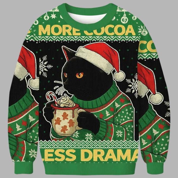 This charming and instantly meme-worthy sweater features a captivating center image of a sophisticated black cat, looking serenely unimpressed by the outside world, yet fully embracing its holiday comfort. The cat is wearing a Santa hat and a cozy green Christmas jumper, delicately holding a mug overflowing with whipped cream, a candy cane, and steaming cocoa. The festive green and black background is adorned with snowflakes and traditional fair isle patterns, giving it a classic ugly sweater look with a modern, internet-culture twist. The bold text at the top and bottom perfectly states your holiday manifesto: “MORE COCOA LESS DRAMA.” This design is a humorous, visual representation of self-care during the busiest time of the year, celebrating the introverted joy of simply staying warm, ignoring the holiday madness, and finding solace in a delicious drink—making it a true emblem of peace and cocoa-fueled tranquility.