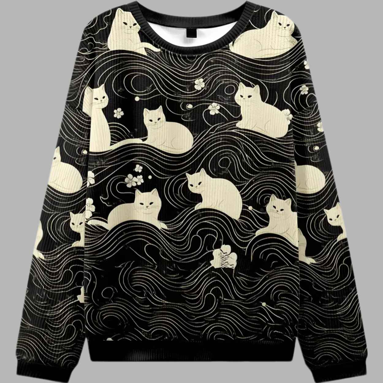 The “Mysterious Cat Christmas Ugly Sweater” is a spectacular, cozy pullover that flawlessly fuses traditional Japanese art influences with a compelling, dark feline theme. The sweater features a dramatic black background entirely covered in an intricate, all-over pattern of stylized white and cream-colored cats. These enigmatic felines are depicted resting or sitting amongst swirling wave lines and scattered delicate flowers, evoking the style of Ukiyo-e woodblock prints and a calm, moonlit sea. The “ugly” aesthetic comes not from clashing colors, but from the mesmerizing, slightly chaotic density of the pattern, which is busy yet deeply engaging. This design transforms the sweater from mere apparel into a wearable piece of art, symbolizing the quiet, independent mystery of the cat and the power of natural forces. It suggests the wearer possesses a contemplative, unconventional spirit and finds beauty in the subtle, flowing chaos of the universe. It’s a warm, comfortable, and immediately eye-catching piece that is perfect for the cat owner with a dark aesthetic, the art enthusiast, or anyone ready to be the center of a wonderfully intriguing conversation.
