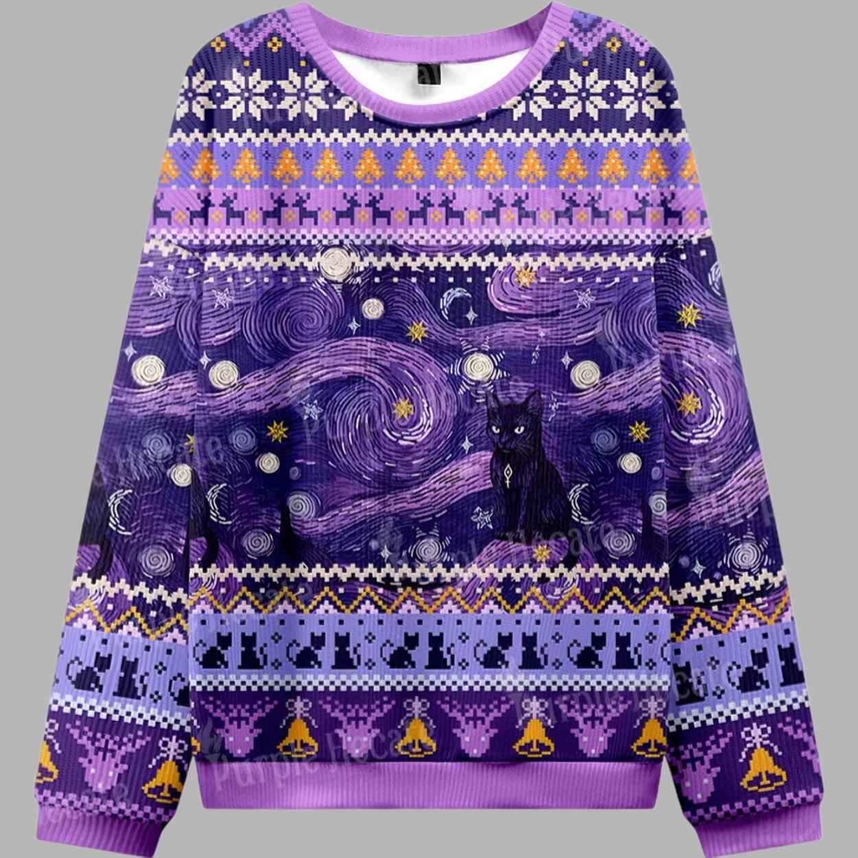 This spectacularly unique sweater is a phenomenal, enchanting addition to the ugly Christmas sweater tradition, designed for those who appreciate gothic charm, mystical themes, and adorable cats. The captivating central graphic features a serene black cat seated majestically under a swirling, painterly sky reminiscent of a famous starry night, with vibrant purples, blues, and gold accents. The scene is filled with celestial motifs like moons, stars, and swirling galaxies, giving the garment a profound, ethereal feel. The design is set against a ribbed background and is framed by intricate fair isle-inspired borders featuring repeating motifs of cats, stars, geometric patterns, and bells in contrasting purples, oranges, and whites. This garment is far more than just holiday apparel; it’s a brilliant, wearable symbol of mystery, intuition, and the magical connection between humans and their feline familiars. It’s an ideal way to showcase your witty, unique personality and inject some unforgettable, witchy charm into any Christmas gathering.