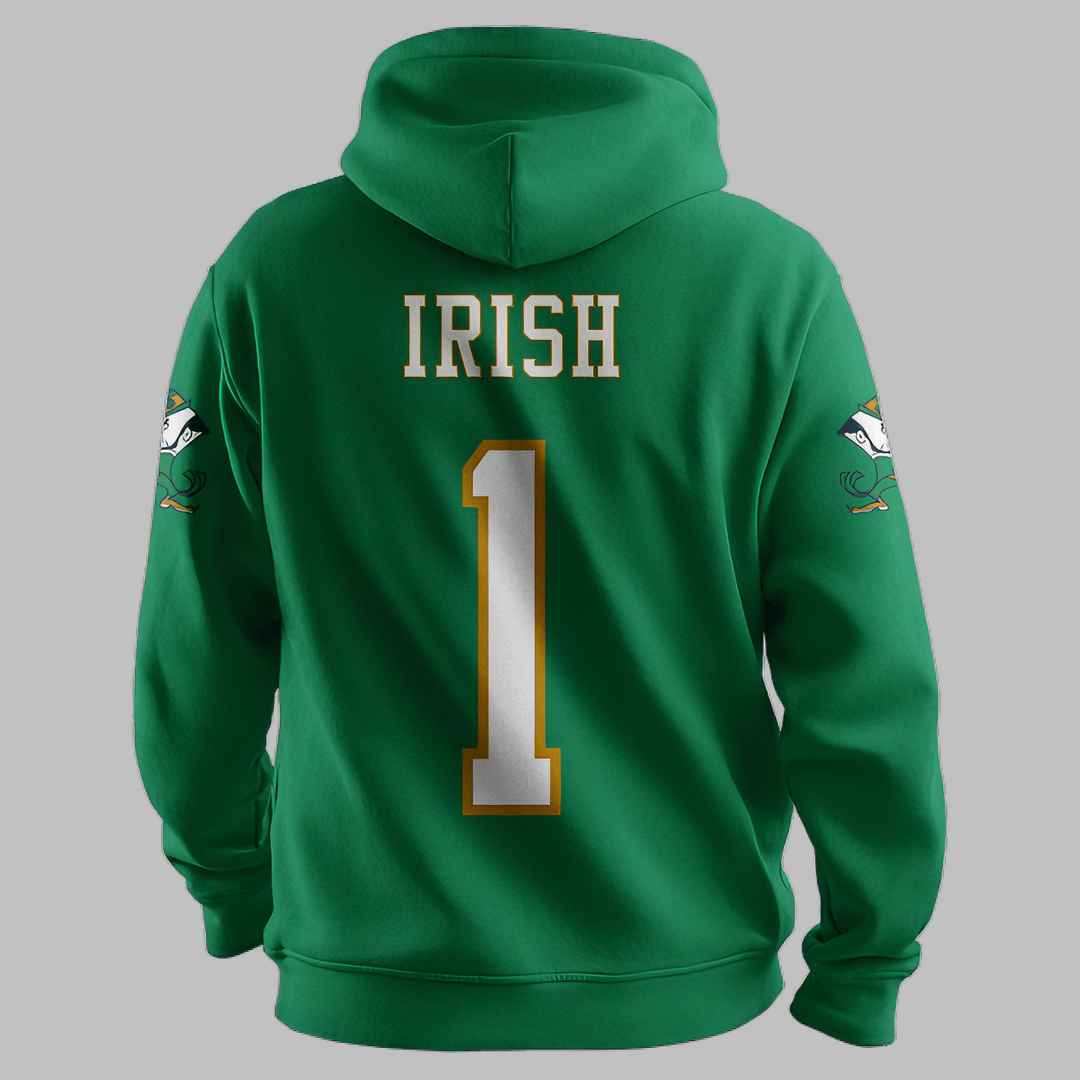 The Notre Dame Football Unisex Hoodie is made from high-quality fabric that is soft, warm, and durable, ensuring you stay cozy in cooler weather. The front of the hoodie features a bold “ND” logo paired with the number “1” in a striking gold and white outline, a tribute to the excellence of Notre Dame football. On the back, “IRISH” and the matching number “1” complete the look, making it a symbol of team spirit and pride.