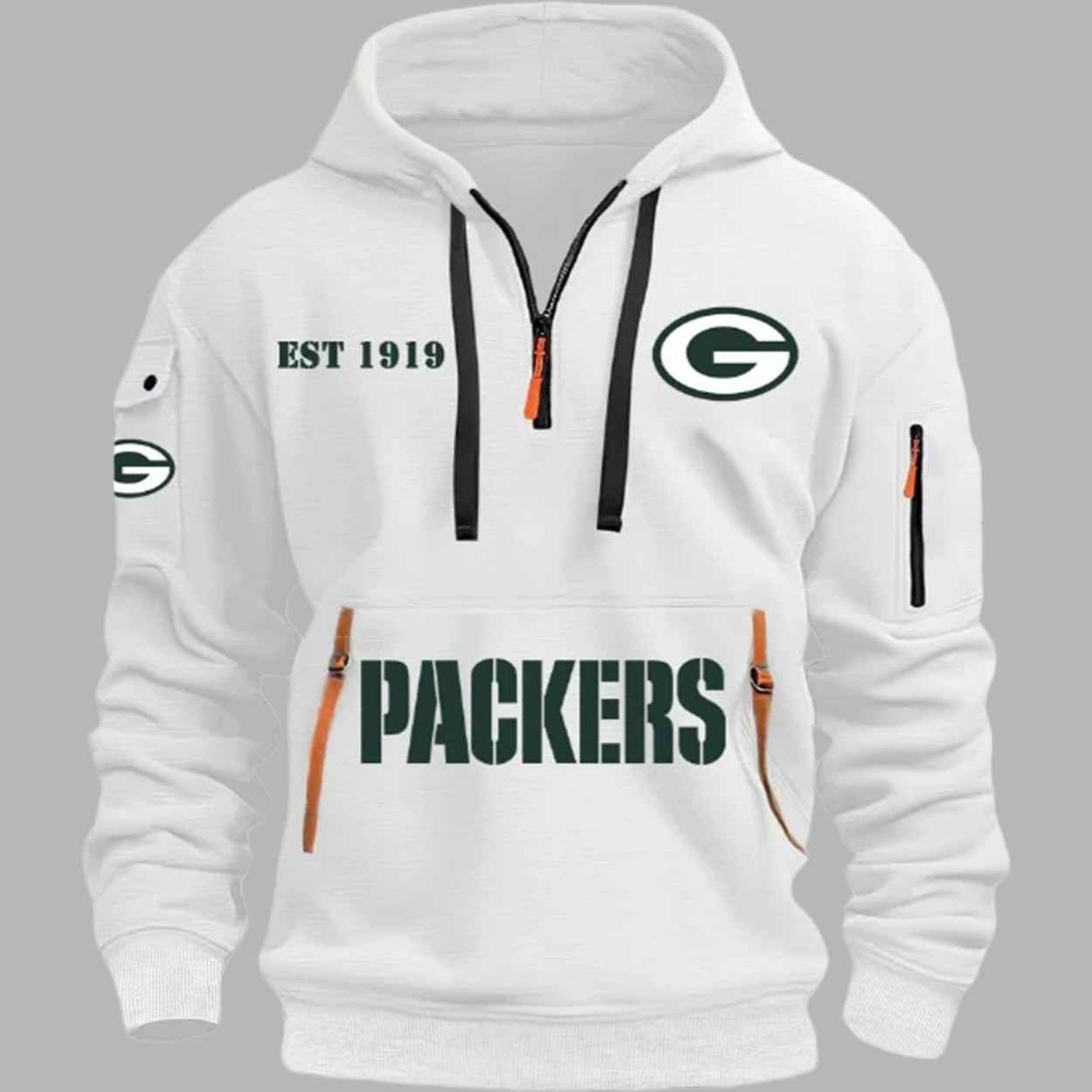 This clean and modern white quarter-zip hoodie features a minimalist design that makes the iconic dark green and gold accents truly stand out. The chest displays a sharp team “G” logo alongside the historic “EST 1919” founding date, while the lower front is anchored by bold “PACKERS” typography. This apparel is more than just a stylish layer; it is a visual tribute to the resilience and deep-rooted traditions of the Green Bay community. Every detail, from the contrasting black drawstrings to the additional emblem on the sleeve, represents a connection to over a century of grit and sporting heritage. It is an elegant way to wear your pride and honor a legacy that has unified dedicated supporters for generations.