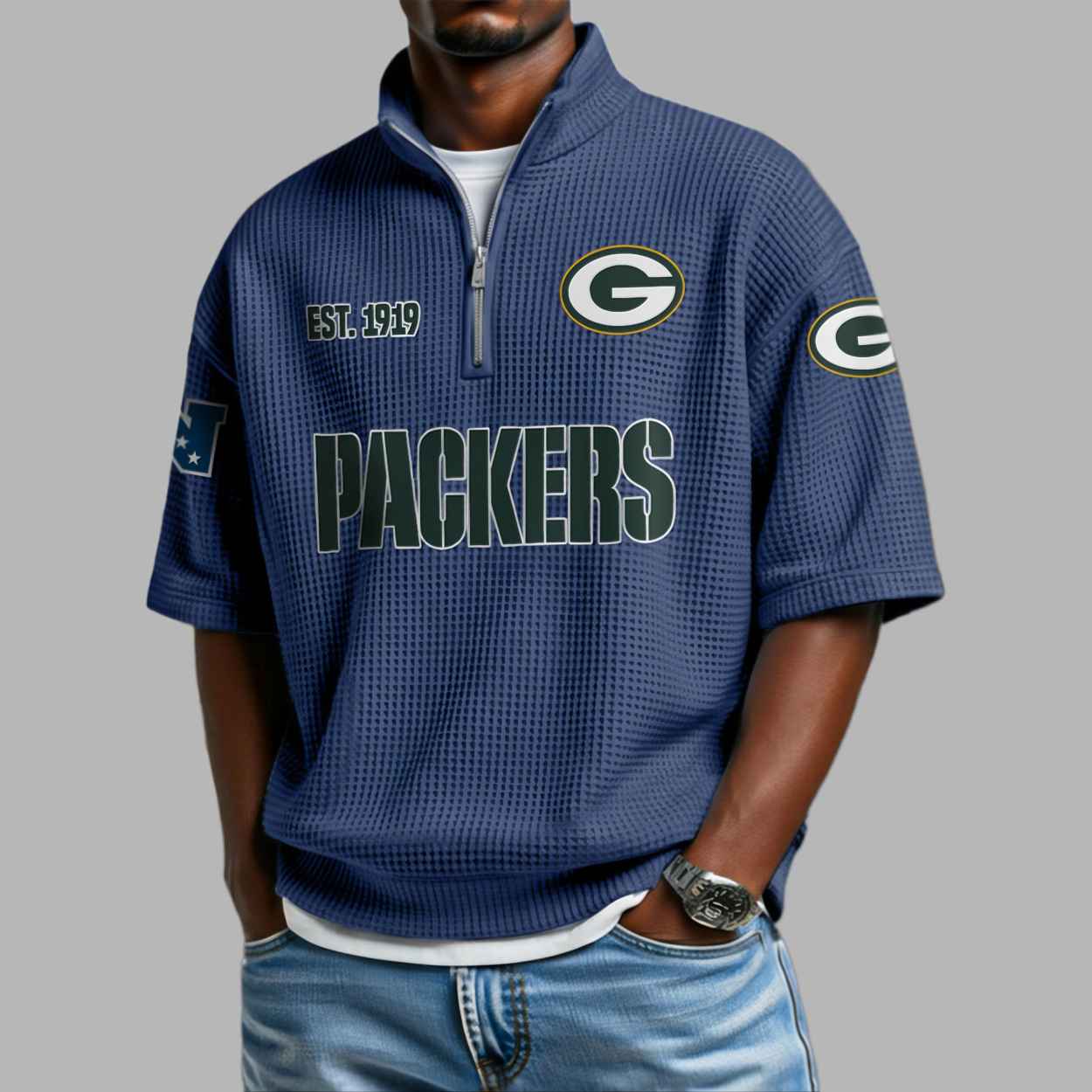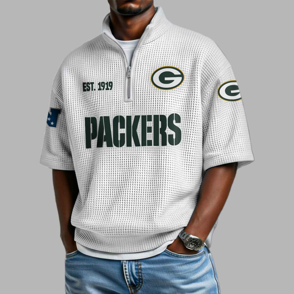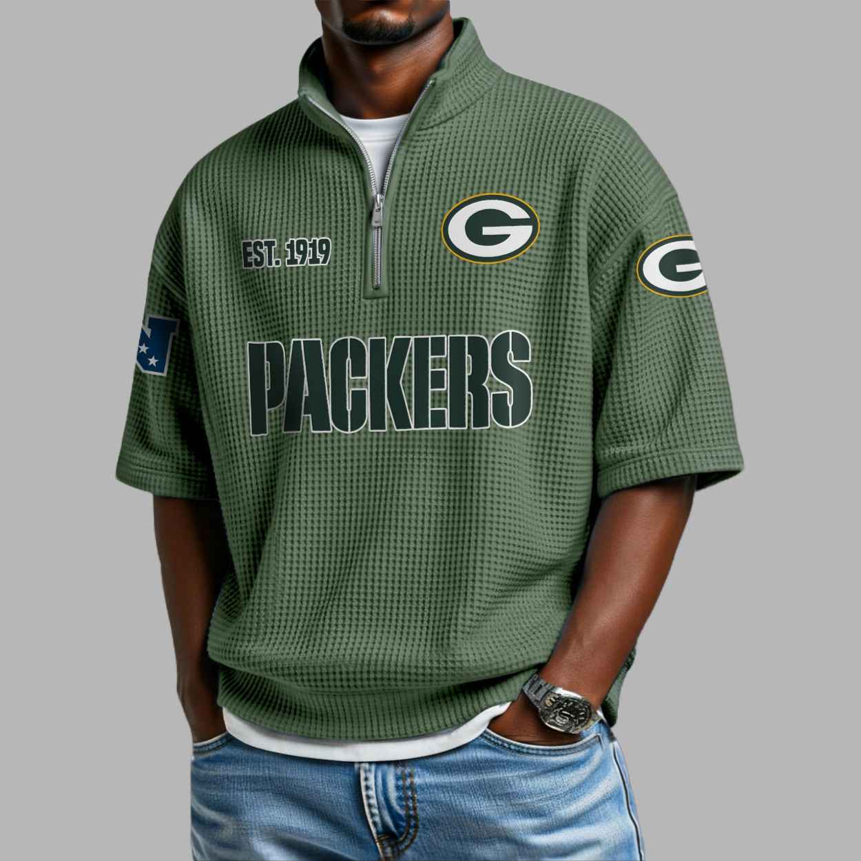 This textured olive green quarter-zip shirt features a modern waffle-knit aesthetic that perfectly highlights the iconic dark green and gold “G” logo. The chest proudly displays the historic “EST 1919” founding date, while bold “PACKERS” typography anchors the central design, representing a deep connection to the resilient Green Bay community. This apparel is more than just a stylish top; it is a visual tribute to over a century of grit and sporting heritage. Every detail, from the additional team emblems on the sleeves to the clean zip-up neckline, symbolizes a fan’s individual pride and unwavering loyalty to a legendary foundation that has defined the game for generations.