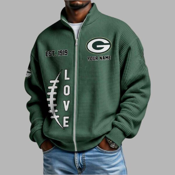 This sophisticated forest green sweatshirt features a modern waffle-knit texture that brings a tactile, high-end feel to your daily wardrobe. The design is a heartfelt tribute to heritage, prominently displaying the iconic “G” emblem on the chest alongside “EST. 1919” to honor one of the most storied founding years in the sport. A unique vertical “LOVE” graphic, creatively detailed with football-style stitching, runs down the front, while the sleeve is finished with additional team logos for a complete, athletic look. Beyond its sharp aesthetic, this garment represents the unyielding spirit of a community-owned legacy that has stood strong through every victory in the Frozen Tundra. It is a creative masterpiece designed for those who value long-standing traditions and want to represent their lifelong passion with a sleek, professional silhouette that transitions perfectly from the stadium to your daily routine.
