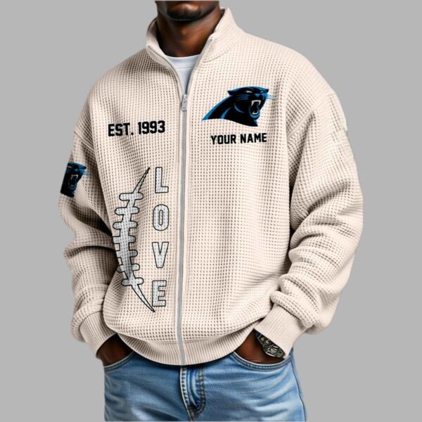 This sophisticated cream-colored sweatshirt features a modern waffle-knit texture that brings a tactile, high-end feel to your daily wardrobe. The design is a heartfelt tribute to heritage, prominently displaying the iconic growling panther emblem on the chest alongside “EST. 1993” to honor the franchise’s historic founding year. A unique vertical “LOVE” graphic, creatively detailed with football-style stitching, runs down the front, while the sleeve is finished with additional team logos for a complete, athletic look. Beyond its sharp aesthetic, this garment represents the unyielding spirit and growth of a community that has stood together since the team’s inaugural era. It is a creative masterpiece designed for those who value long-standing traditions and want to represent their lifelong passion with a sleek, professional silhouette that transitions perfectly from the stadium to your daily routine.