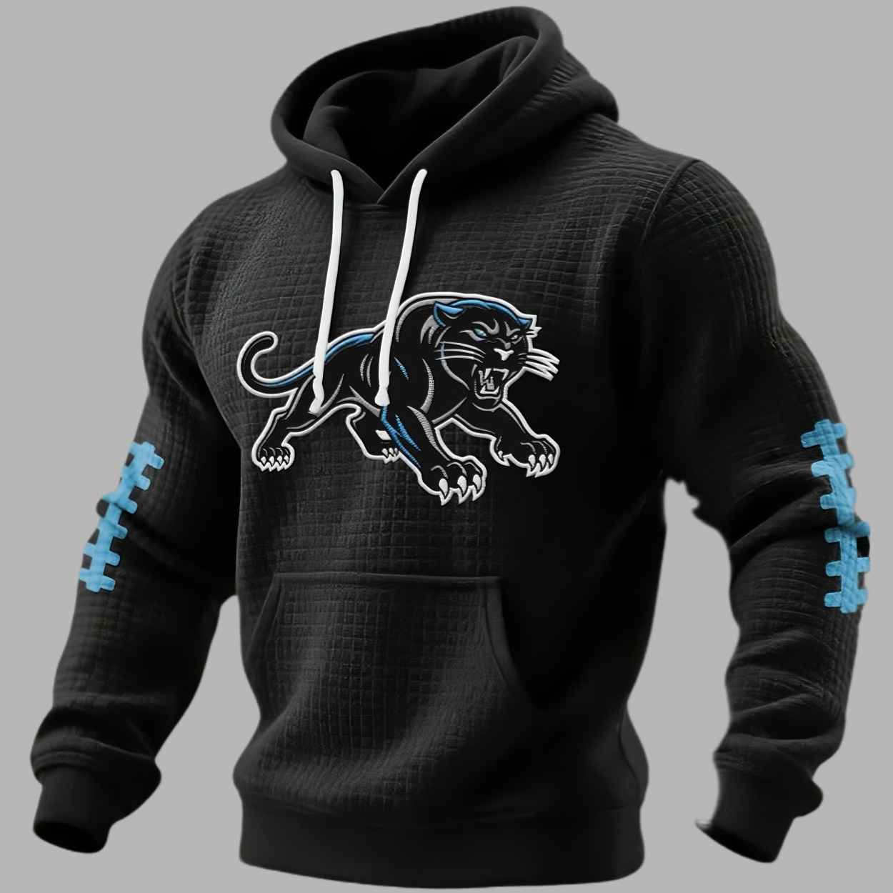 This premium black hoodie features a specialized waffle-knit texture that provides a sophisticated, multi-dimensional look to a classic athletic silhouette. The center chest is dominated by a powerful, high-definition graphic of a leaping panther, outlined in vibrant blue and white to symbolize the agility and predatory instinct of the franchise. Adding a unique and creative touch, the sleeves are accented with textured light blue patches that mimic the laces of a football, blending sports culture with modern utility. Beyond its bold appearance, this garment serves as a wearable tribute to the resilience and deep-rooted pride of the fan community. Every detail, from the integrated hood with contrasting white drawstrings to the spacious kangaroo pocket, reflects a commitment to a contemporary aesthetic that honors a storied heritage while standing out in the crowd.