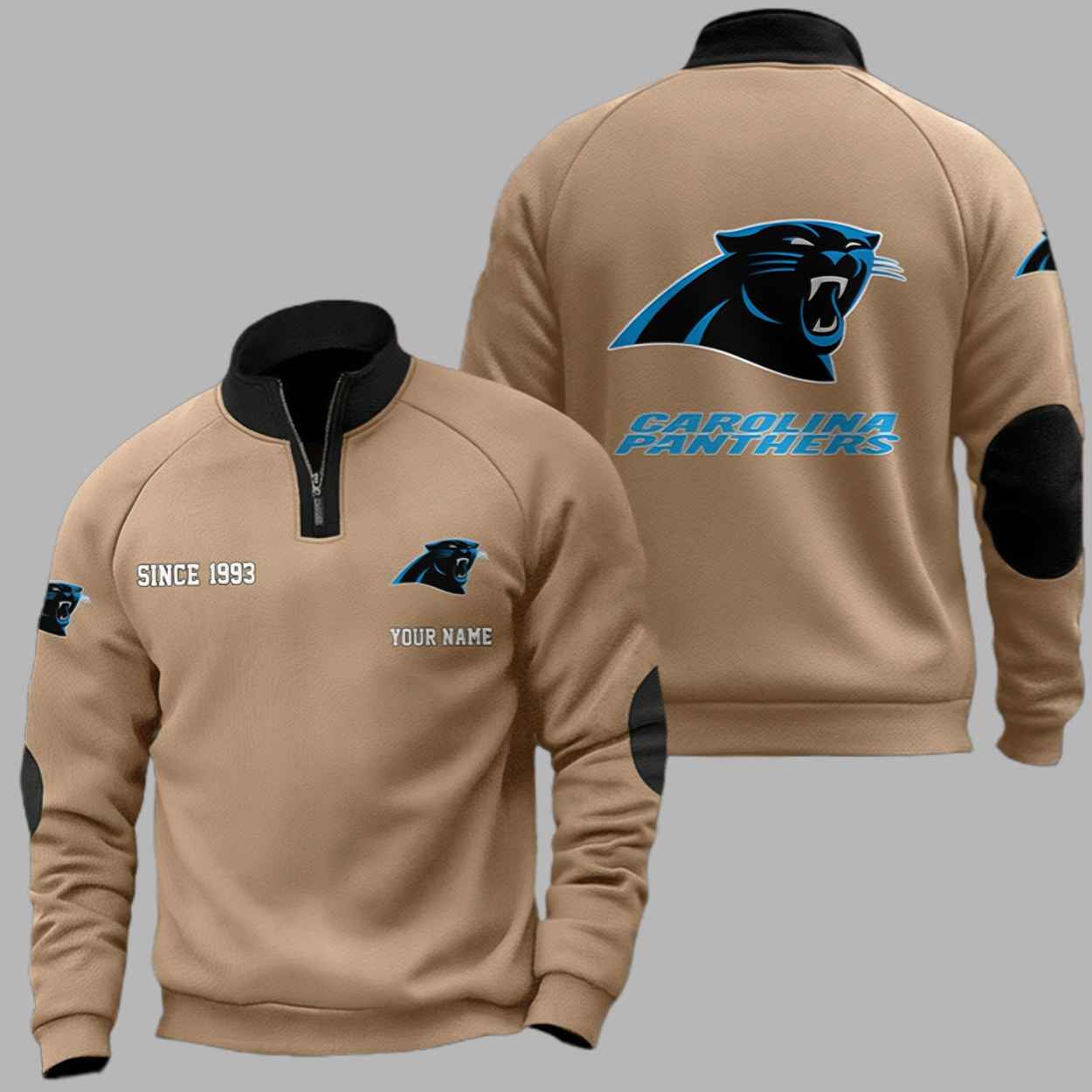 This premium heather grey sweatshirt features a sophisticated black quarter-zip collar and matching reinforced elbow patches that add a touch of modern utility to a classic design. The chest is detailed with the historic “SINCE 1993” founding year alongside a sharp panther head logo, while the back displays a massive, high-definition team emblem and bold “CAROLINA PANTHERS” typography. Beyond its stylish appearance, this garment serves as a wearable tribute to the resilience and deep-rooted traditions of the Carolina community. Every detail, from the clean silhouette to the personalized “Your Name” feature, represents a unique connection to a heritage of passion that has unified dedicated supporters for generations.