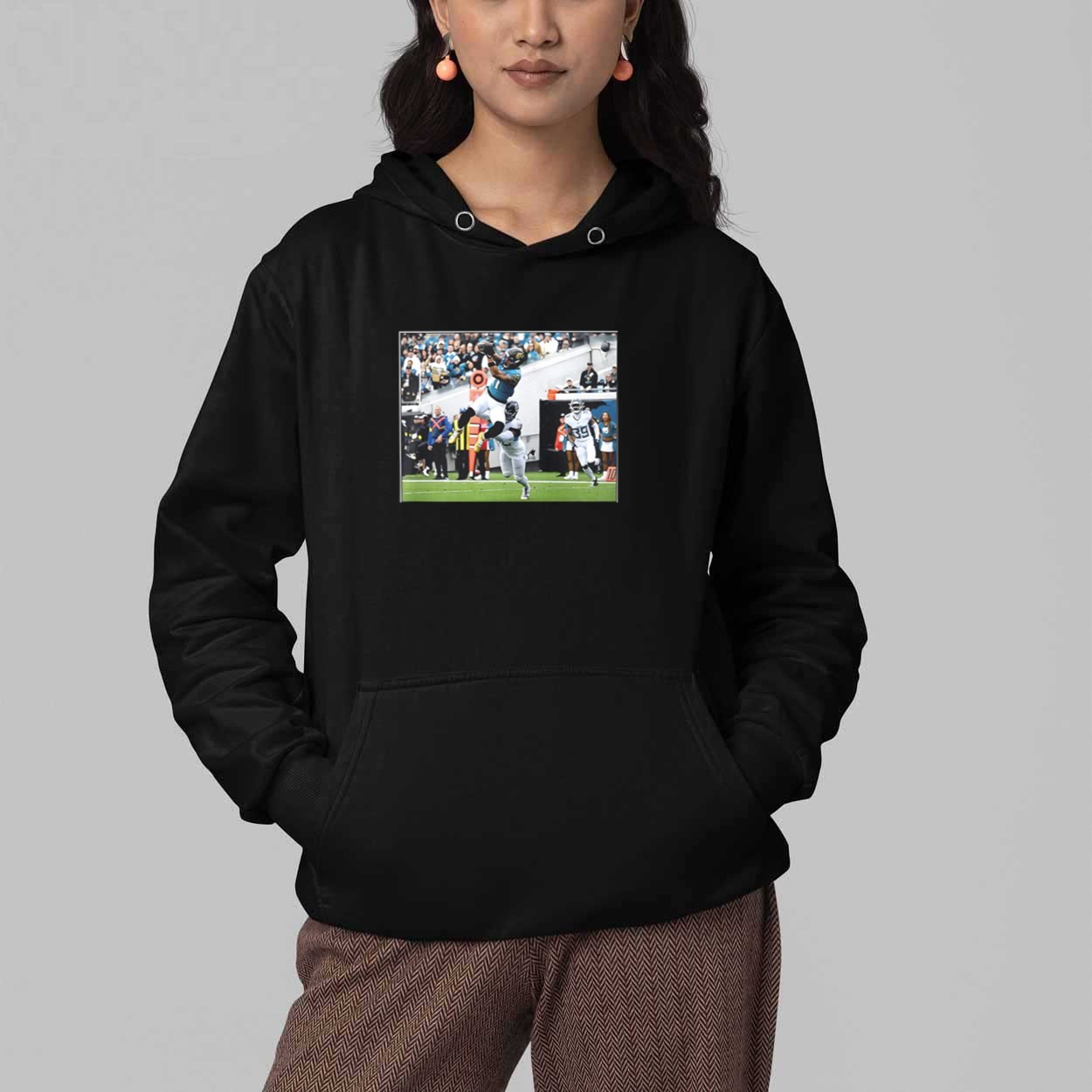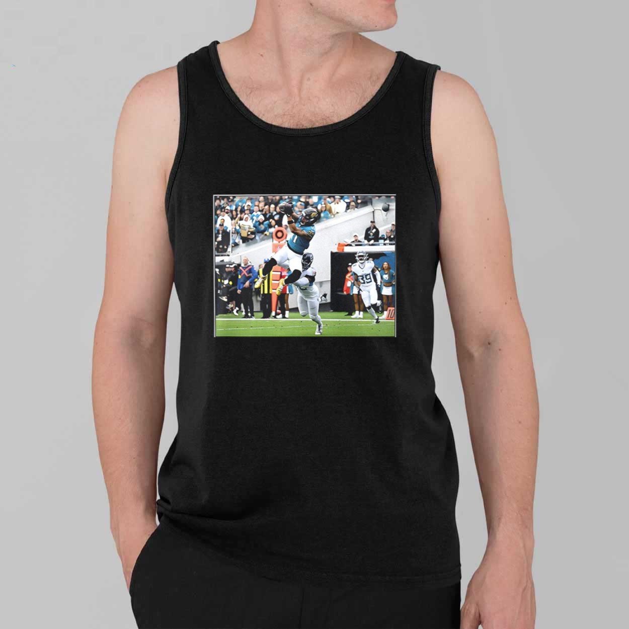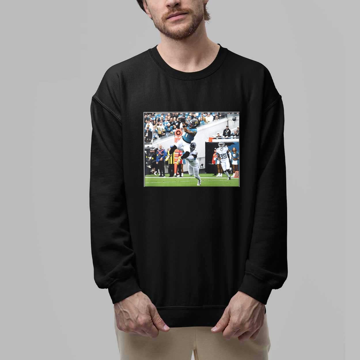 This black t-shirt features a high-definition action photograph capturing Parker Washington in a breathtaking mid-air display of athleticism during a pivotal Week 18 performance. The graphic perfectly preserves the “Flash Features” moment, showcasing the determination and elite skill required to make a game-changing catch under pressure. Beyond its sharp visual appeal, this garment serves as a wearable tribute to the future of the franchise and the thrilling energy that keeps fans on the edge of their seats. It is a creative masterpiece designed for those who want to carry a piece of the season’s excitement wherever they go, making it a timeless memory for every dedicated supporter.